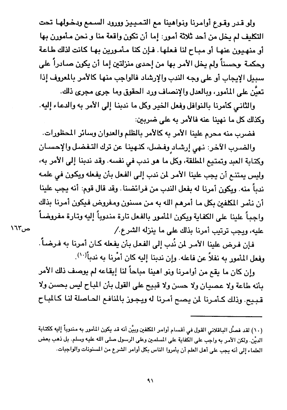 ولو قدر وقوع أوامرنا ونواهينا مع التمييز وورود السمع ودخولها تحت التكليف لم يخل من أحد ثلاثة أمور: إما أن تكون واقعةً منا ونحن مأمورون بها أو منهيين عنها أو مباح لنا فعلها. فإن كنا مأمورين بها كانت لذلك طاعة وحكمةً، وحسنًا ولم يخل الأمر بها من إحدى منزلتين إما أن يكون صادرًا على سبيل الإيجاب أو على وجه الندب والإرشاد فالواجب منها كالأمر بالمعروف إذا تعين على المأمور، وبالعدل والإنصاف ورد الحقوق وما جرى مجرى ذلك.