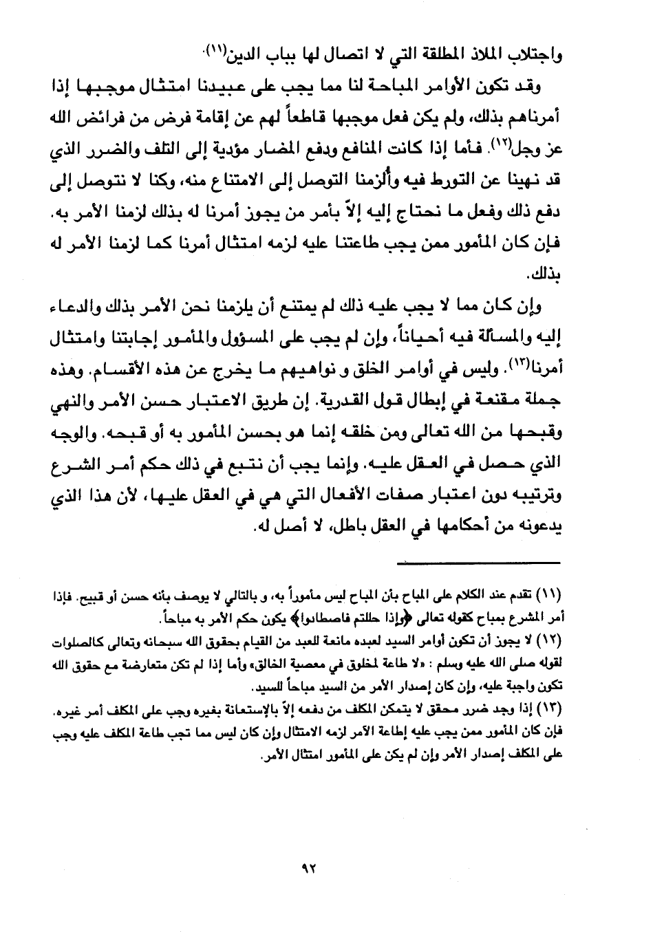 وقد تكون الأوامر المباحة لنا مما يجب على عبيدنا امتثال موجبها إذا أمرناهم بذلك? ولم يكن فعل موجبها قاطعًا لهم عن إقامة فرض من فرائض الله عز وجل. فأما إذا كانت المنافع ودفع المضار مؤدية إلى التلف والضرر الذي قد نهينا عن التورط فيه وألزمنا التوصل إلى الامتناع منه? وكنا لا نتوصل إلى دفع ذلك وفعل ما نحتاج إليه إلا بأمر من يجوز أمرنا له بذلك لزمنا الأمر به. فإن كان المأمور ممن يجب طاعتنا عليه لزمه امتثال أمرنا كما لزمنا الأمر له بذلك.