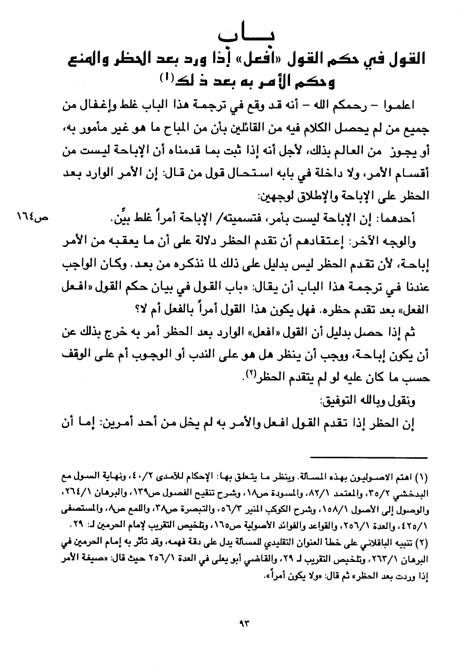 والوجه الآخر: اعتقادهم أن تقدم الحظر دلالة على أن ما يعقبه من الأمر إباحة، لأن تقدم الحظر ليس بدليل على ذلك لما نذكره من بعد. وكان الواجب عندنا في ترجمة هذا الباب أن يقال: ((باب القول في بيان حكم القول ((افعل الفعل)) بعد تقدم حظره. فهل يكون هذا القول أمرًا بالفعل أم لا؟