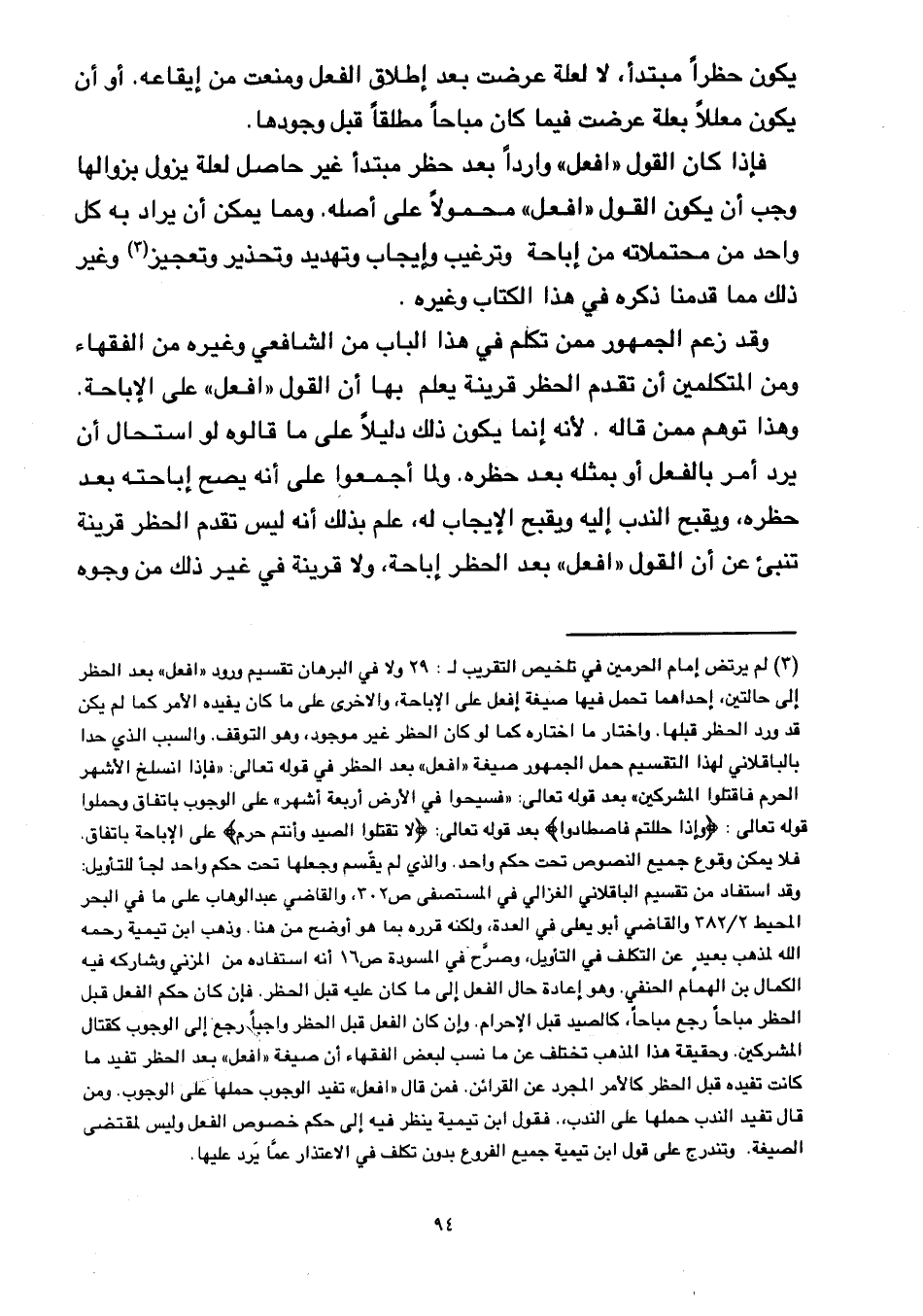 فإذا كان القول ((افعل)) واردًا بعد حظر مبتدأ غير حاصل لعلة يزول بزوالها وجب أن يكون القول ((افعل)) محمولًا على أصله. ومما يمكن أن يراد به كل واحد من محتملاته من إباحة وترغيب وإيجاب وتهديد وتحذير وتعجيز وغير ذلك مما قدمنا ذكره في هذا الكتاب وغيره.