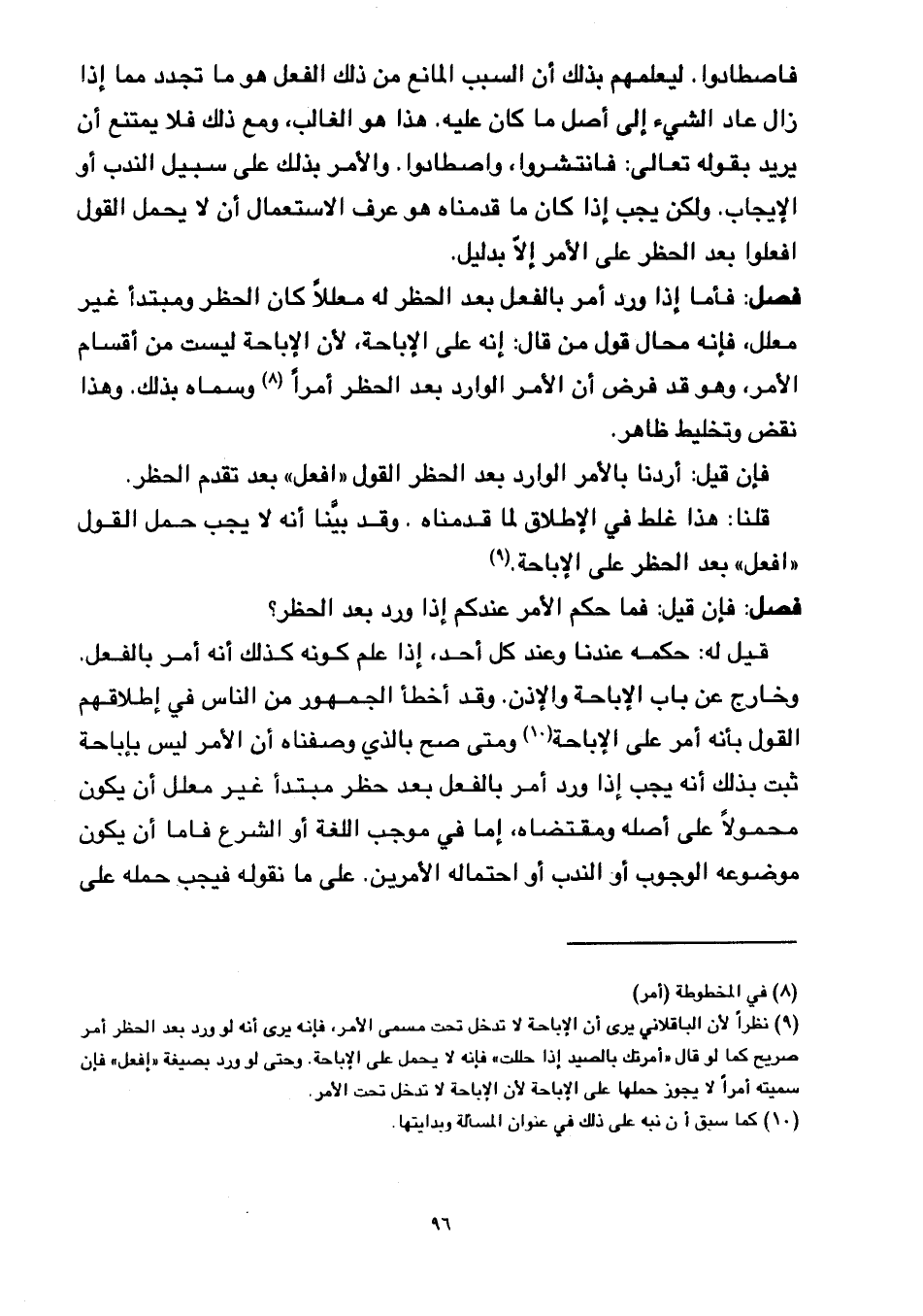 فصل: فأما إذا ورد أمر بالفعل بعد الحظر له معللًا كان الحظر ومبتدأ غير معلل، فإنه محال قول من قال: إنه على الإباحة، لأن الإباحة ليست من أقسام الأمر، وهو قد فرض أن الأمر الوارد بعد الحظر أمرًا وسماه بذلك. وهذا نقض وتخليط ظاهر.