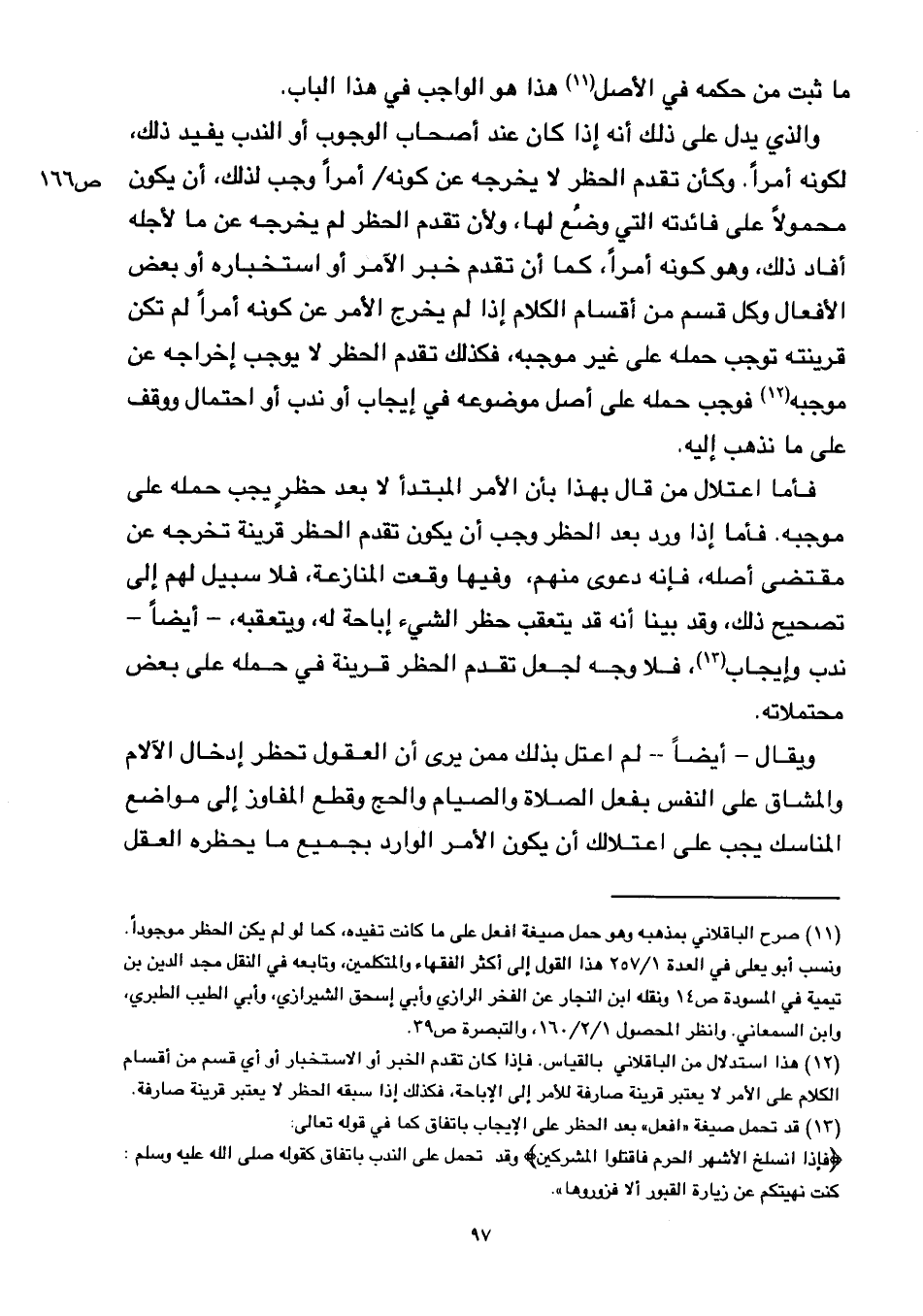 والذي يدل على ذلك أنه إذا كان عند أصحاب الوجوب أو الندب يفيد ذلك، لكونه أمرًا. وكأن تقدم الحظر لا يخرجه عن كونه/ أمرًا وجب لذلك، أن يكون ص (١٦٧) محمولًا على فائدته التي وضع لها، ولأن تقدم الحظر لم يخرجه عن ما لأجله أفاد ذلك، وهو كونه أمرًا، كما أن تقدم خبر الآمر أو استخباره أو بعض الأفعال وكل قسم من أقسام الكلام إذا لم يخرج الأمر عن كونه أمرًا لم تكن قرينته توجب حمله على غير موجبه، فكذلك تقدم الحظر لا يوجب إخراجه عن موجبه فوجب حمله على أصل موضوعه في إيجاب أو ندب أو احتمال ووقف على ما نذهب إليه.