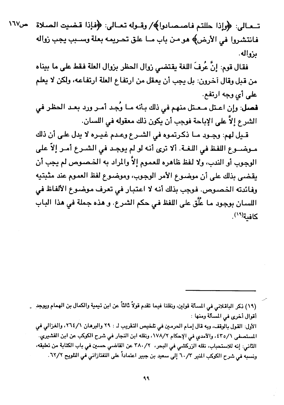 تعالى: {وَإِذَا حَلَلْتُمْ فَاصْطَادُوا} وقوله تعالى: {فَإِذَا قُضِيَتِ الصَّلَاةُ فَانتَشِرُوا فِي الْأَرْضِ} هو من باب ما علق تحريمه بعلة وسبب يجب زواله بزواله.
