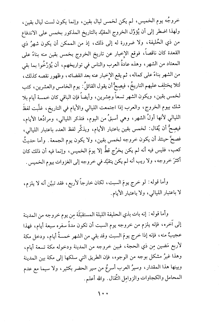 خُرُوجُهُ يَوْمَ الْخَمِيسِ لَمْ يَكُنْ لِخَمْسِ لَيَالٍ بَقِينَ، وَإِنَّمَا يَكُونُ لِسِتِّ لَيَالٍ بَقِينَ، وَلِهَذَا اضْطُرَّ إِلَى أَنْ يُؤَوَّلَ الْخُرُوجَ الْمُقَيَّدَ بِالتَّارِيخِ الْمَذْكُورِ بِخَمْسٍ عَلَى الِانْدِفَاعِ مِنْ ذِي الْحُلَيْفَةِ، وَلَا ضَرُورَةَ لَهُ إِلَى ذَلِكَ، إِذْ مِنَ الْمُمْكِنِ أَنْ يَكُونَ شَهْرُ ذِي الْقَعْدَةِ كَانَ نَاقِصًا، فَوَقَعَ الْإِخْبَارُ عَنْ تَارِيخِ الْخُرُوجِ بِخَمْسٍ بَقِينَ مِنْهُ بِنَاءً عَلَى الْمُعْتَادِ مِنَ الشَّهْرِ، وَهَذِهِ عَادَةُ الْعَرَبِ وَالنَّاسِ فِي تَوَارِيخِهِمْ، أَنْ يُؤَرِّخُوا بِمَا بَقِيَ مِنَ الشَّهْرِ بِنَاءً عَلَى كَمَالِهِ، ثُمَّ يَقَعُ الْإِخْبَارُ عَنْهُ بَعْدَ انْقِضَائِهِ وَظُهُورِ نَقْصِهِ كَذَلِكَ لِئَلَّا يَخْتَلِفَ عَلَيْهِمُ التَّارِيخُ فَيَصِحُّ أَنْ يَقُولَ الْقَائِلُ: يَوْمَ الْخَامِسِ وَالْعِشْرِينَ كُتِبَ لِخَمْسٍ بَقِينَ، وَيَكُونُ الشَّهْرُ تِسْعًا وَعِشْرِينَ، وَأَيْضًا فَإِنَّ الْبَاقِيَ كَانَ خَمْسَةَ أَيَّامٍ بِلَا شَكٍّ بِيَوْمِ الْخُرُوجِ، وَالْعَرَبُ إِذَا اجْتَمَعَتِ اللَّيَالِي وَالْأَيَّامُ فِي التَّارِيخِ غَلَّبَتْ لَفْظَ اللَّيَالِي لِأَنَّهَا أَوَّلُ الشَّهْرِ، وَهِيَ أَسْبَقُ مِنَ الْيَوْمِ، فَتَذْكُرُ اللَّيَالِيَ وَمُرَادُهَا الْأَيَّامُ، فَيَصِحُّ أَنْ يُقَالَ: لِخَمْسٍ بَقِينَ بِاعْتِبَارِ الْأَيَّامِ، وَيُذَكَّرُ لَفْظُ الْعَدَدِ بِاعْتِبَارِ اللَّيَالِي، فَصَحَّ حِينَئِذٍ أَنْ يَكُونَ خُرُوجُهُ لِخَمْسٍ بَقِينَ وَلَا يَكُونُ يَوْمَ الْجُمُعَةِ.