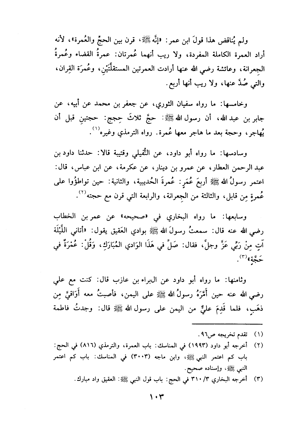 وَخَامِسُهَا: مَا رَوَاهُ سُفْيَانُ الثَّوْرِيُّ، عَنْ جَعْفَرِ بْنِ مُحَمَّدٍ، عَنْ أَبِيهِ، عَنْ جَابِرِ بْنِ عَبْدِ اللَّهِ، أَنَّ رَسُولَ اللَّهِ صَلَّى اللَّهُ عَلَيْهِ وَسَلَّمَ: ( «حَجَّ ثَلَاثَ حِجَجٍ: حَجَّتَيْنِ قَبْلَ أَنْ يُهَاجِرَ، وَحَجَّةً بَعْدَمَا هَاجَرَ مَعَهَا عُمْرَةٌ» ) . رَوَاهُ الترمذي وَغَيْرُهُ.