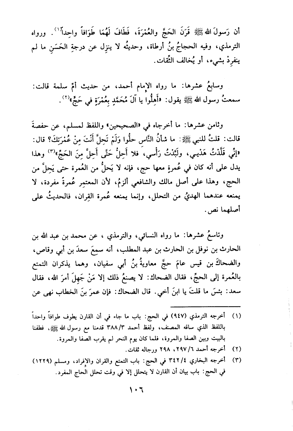 وَتَاسِعُ عَشْرِهَا: مَا رَوَاهُ النَّسَائِيُّ، وَالتِّرْمِذِيُّ، عَنْ محمد بن عبد الله بن الحارث بن نوفل بن الحارث بن عبد المطلب، أَنَّهُ «سَمِعَ سَعْدَ بْنَ أَبِي وَقَّاصٍ، وَالضَّحَّاكَ بْنَ قَيْسٍ عَامَ حَجَّ مُعَاوِيَةُ بْنُ أَبِي سُفْيَانَ، وَهُمَا يَذْكُرَانِ التَّمَتُّعَ بِالْعُمْرَةِ إِلَى الْحَجِّ، فَقَالَ الضحاك: لَا يَصْنَعُ ذَلِكَ إِلَّا مَنْ جَهِلَ أَمْرَ اللَّهِ، فَقَالَ سعد: بِئْسَ مَا قُلْتَ يَا ابْنَ أَخِي. قَالَ الضحاك: فَإِنَّ عُمَرَ بْنَ الْخَطَّابِ نَهَى عَنْ