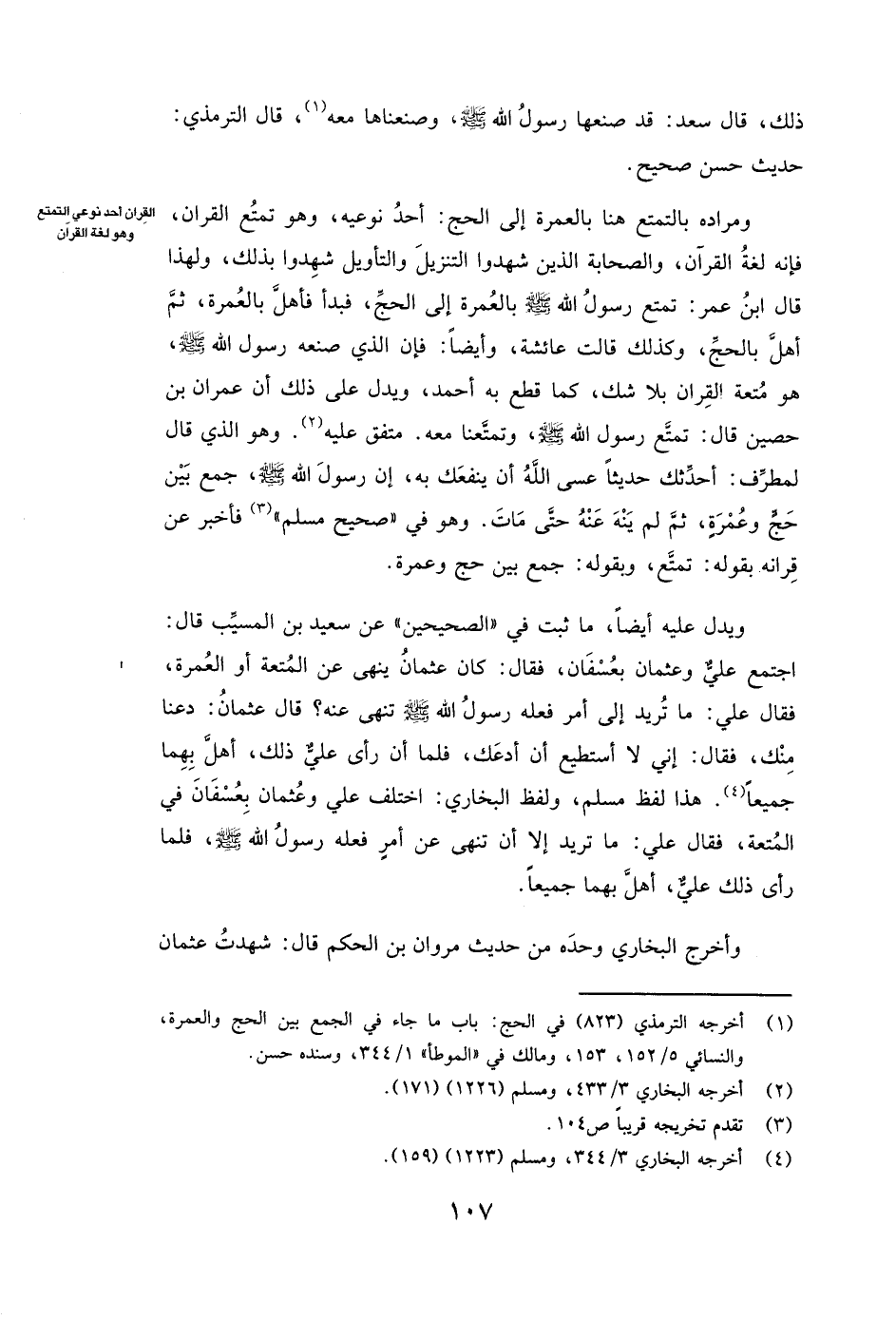 وَيَدُلُّ عَلَيْهِ أَيْضًا، مَا ثَبَتَ فِي " الصَّحِيحَيْنِ " عَنْ سَعِيدِ بْنِ الْمُسَيَّبِ قَالَ: «اجْتَمَعَ علي وعثمان بِعُسْفَانَ، فَقَالَ: كَانَ عثمان يَنْهَى عَنِ الْمُتْعَةِ أَوِ الْعُمْرَةِ، فَقَالَ علي: مَا تُرِيدُ إِلَى أَمْرٍ فَعَلَهُ رَسُولُ اللَّهِ صَلَّى اللَّهُ عَلَيْهِ وَسَلَّمَ تَنْهَى عَنْهُ؟ قَالَ عثمان: دَعْنَا مِنْكَ، فَقَالَ: إِنِّي لَا أَسْتَطِيعُ أَنْ أَدَعَكَ، فَلَمَّا أَنْ رَأَى علي ذَلِكَ، أَهَلَّ بِهِمَا جَمِيعًا» . هَذَا لَفْظُ مسلم، وَلَفْظُ الْبُخَارِيِّ: اخْتَلَفَ ( «علي وعثمان بِعُسْفَانَ فِي الْمُتْعَةِ، فَقَالَ علي: مَا تُرِيدُ إِلَّا أَنْ تَنْهَى عَنْ أَمْرٍ فَعَلَهُ رَسُولُ اللَّهِ صَلَّى اللَّهُ عَلَيْهِ وَسَلَّمَ، فَلَمَّا رَأَى ذَلِكَ عَلِيٌّ، أَهَلَّ بِهِمَا جَمِيعًا» ) .