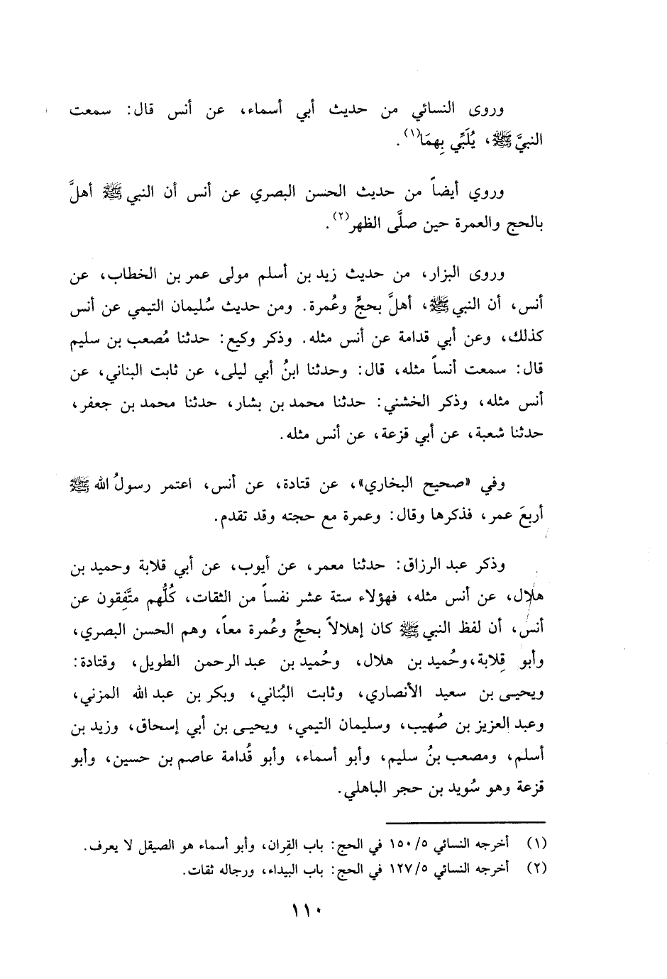 وَذَكَرَ عبد الرزاق: حَدَّثَنَا معمر، عَنْ أيوب، عَنْ أبي قلابة وَحُمَيْدِ بْنِ هِلَالٍ، عَنْ أنس مِثْلَهُ، فَهَؤُلَاءِ سِتَّةَ عَشَرَ نَفْسًا مِنَ الثِّقَاتِ، كُلُّهُمْ مُتَّفِقُونَ عَنْ أنس، أَنَّ لَفْظَ النَّبِيِّ صَلَّى اللَّهُ عَلَيْهِ وَسَلَّمَ كَانَ إِهْلَالًا بِحَجٍّ وَعُمْرَةٍ مَعًا، وَهُمُ الْحَسَنُ الْبَصْرِيُّ، وأبو قلابة، وَحُمَيْدُ بْنُ هِلَالٍ، وحميد بن عبد الرحمن الطويل، وقتادة، وَيَحْيَى بْنُ سَعِيدٍ الْأَنْصَارِيُّ، وَثَابِتٌ الْبُنَانِيُّ، وَبَكْرُ بْنُ عَبْدِ اللَّهِ الْمُزَنِيُّ، وَعَبْدُ الْعَزِيزِ بْنُ صُهَيْبٍ، وَسُلَيْمَانُ التَّيْمِيُّ، ويحيى بن أبي إسحاق، وَزَيْدُ بْنُ أَسْلَمَ، ومصعب بن سليم، وأبو أسماء، وأبو قدامة عاصم بن حسين، وأبو قزعة وهو سويد بن حجر الباهلي.
