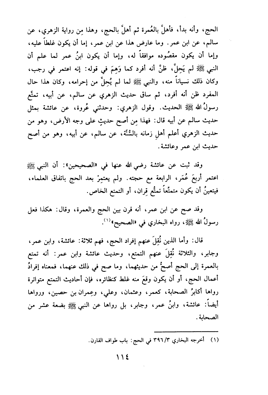 الْحَجِّ، وَأَنَّهُ بَدَأَ فَأَهَلَّ بِالْعُمْرَةِ ثُمَّ أَهَلَّ بِالْحَجِّ، وَهَذَا مِنْ رِوَايَةِ الزُّهْرِيِّ، عَنْ سالم عَنِ ابْنِ عُمَرَ. وَمَا عَارَضَ هَذَا عَنِ ابْنِ عُمَرَ، إِمَّا أَنْ يَكُونَ غَلَطًا عَلَيْهِ، وَإِمَّا أَنْ يَكُونَ مَقْصُودُهُ مُوَافِقًا لَهُ، وَإِمَّا أَنْ يَكُونَ ابْنُ عُمَرَ لَمَّا عَلِمَ أَنَّ النَّبِيَّ صَلَّى اللَّهُ عَلَيْهِ وَسَلَّمَ لَمْ يَحِلَّ ظَنَّ أَنَّهُ أَفْرَدَ كَمَا وَهِمَ فِي قَوْلِهِ: إِنَّهُ اعْتَمَرَ فِي رَجَبٍ، وَكَانَ ذَلِكَ نِسْيَانًا مِنْهُ، وَالنَّبِيُّ صَلَّى اللَّهُ عَلَيْهِ وَسَلَّمَ لَمَّا لَمْ يَحِلَّ مِنْ إِحْرَامِهِ، وَكَانَ هَذَا حَالَ الْمُفْرِدِ ظَنَّ أَنَّهُ أَفْرَدَ، ثُمَّ سَاقَ حَدِيثَ الزُّهْرِيِّ عَنْ سالم، عَنْ أَبِيهِ، تَمَتَّعَ رَسُولُ اللَّهِ صَلَّى اللَّهُ عَلَيْهِ وَسَلَّمَ الْحَدِيثَ.