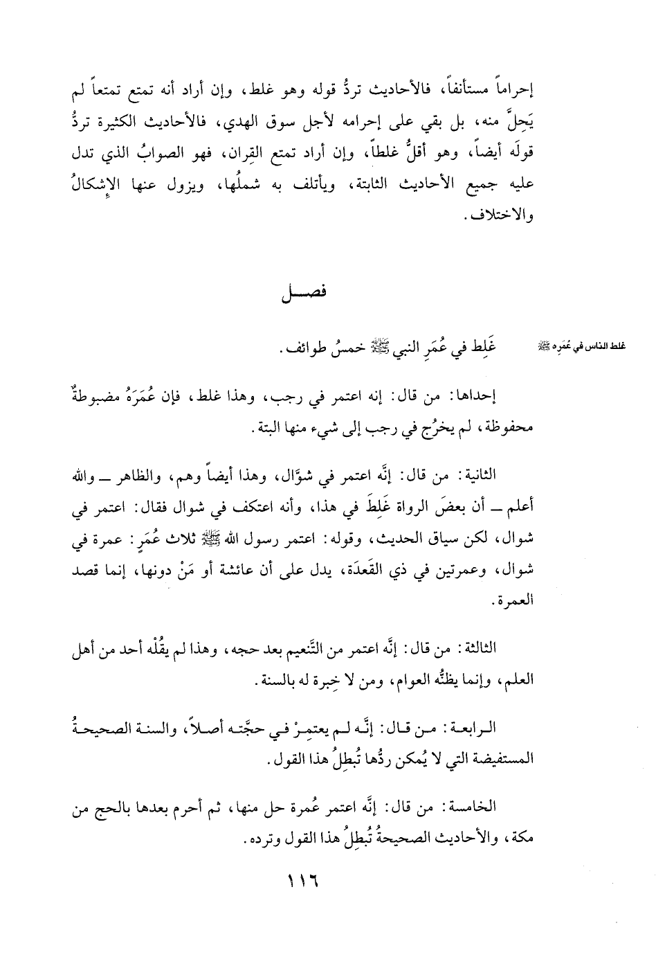 إِحْدَاهَا: مَنْ قَالَ: إِنَّهُ اعْتَمَرَ فِي رَجَبٍ، وَهَذَا غَلَطٌ، فَإِنَّ عُمَرَهُ مَضْبُوطَةٌ مَحْفُوظَةٌ، لَمْ يَخْرُجْ فِي رَجَبٍ إِلَى شَيْءٍ مِنْهَا الْبَتَّةَ.
