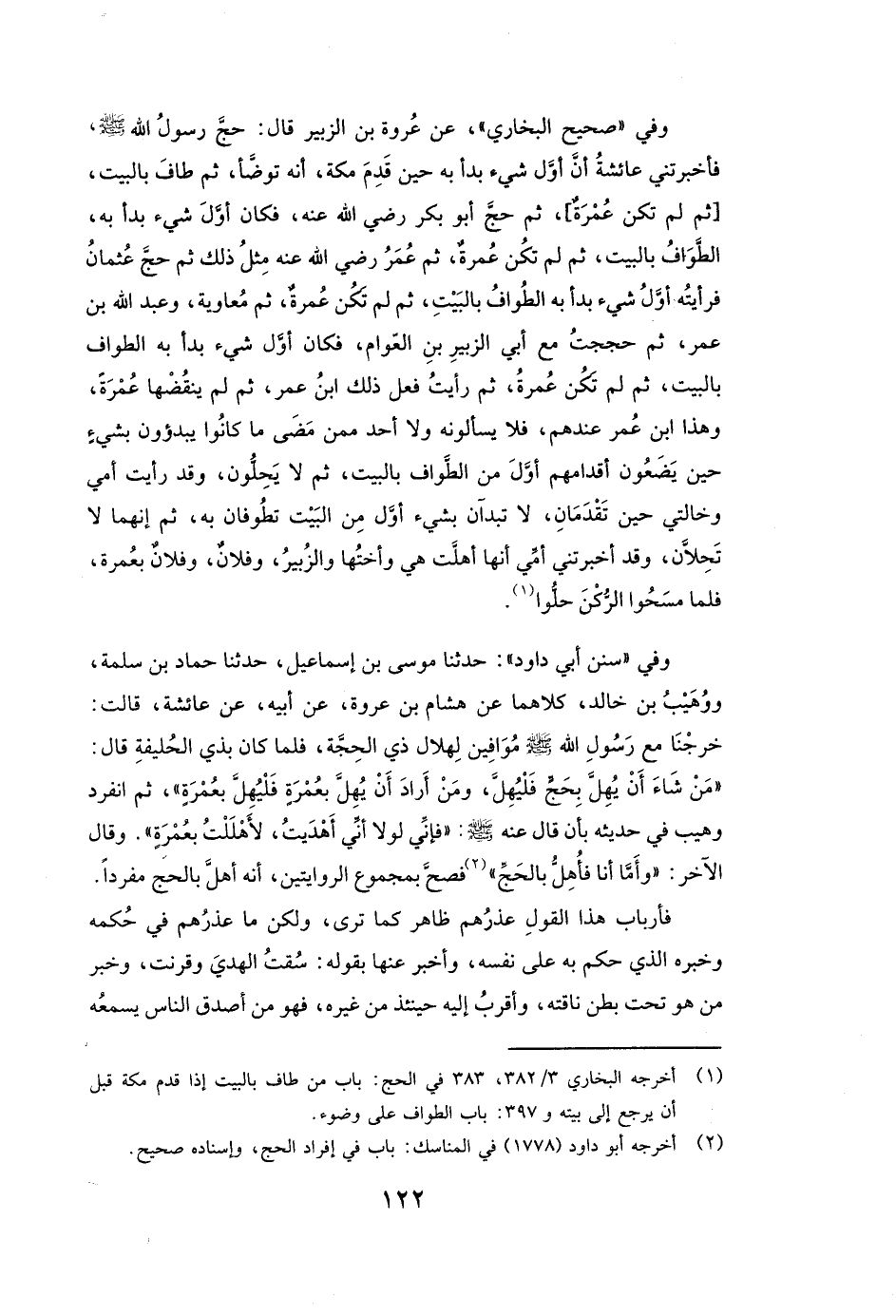 وَفِي" سُنَنِ أبي داود ": حَدَّثَنَا مُوسَى بْنُ إِسْمَاعِيلَ، حَدَّثَنَا حَمَّادُ بْنُ سَلَمَةَ، وَوُهَيْبُ بْنُ خَالِدٍ، كِلَاهُمَا عَنْ هِشَامِ بْنِ عُرْوَةَ، عَنْ أَبِيهِ، عَنْ عائشة قَالَتْ: «خَرَجْنَا مَعَ رَسُولِ اللَّهِ صَلَّى اللَّهُ عَلَيْهِ وَسَلَّمَ مُوَافِينَ لِهِلَالِ ذِي الْحِجَّةِ، فَلَمَّا كَانَ بِذِي الْحُلَيْفَةِ قَالَ: (مَنْ شَاءَ أَنْ يُهِلَّ بِحَجٍّ فَلْيُهِلَّ، وَمَنْ أَرَادَ أَنْ يُهِلَّ بِعُمْرَةٍ فَلْيُهِلَّ بِعُمْرَةٍ» ) ثُمَّ انْفَرَدَ وهيب فِي حَدِيثِهِ بِأَنْ قَالَ عَنْهُ صَلَّى اللَّهُ عَلَيْهِ وَسَلَّمَ: ( «فَإِنِّي لَوْلَا أَنِّي أَهْدَيْتُ لَأَهْلَلْتُ بِعُمْرَةٍ» ) . وَقَالَ الْآخَرُ: ( «وَأَمَّا أَنَا فَأُهِلُّ بِالْحَجِّ» ) فَصَحَّ بِمَجْمُوعِ الرِّوَايَتَيْنِ أَنَّهُ (أَهَلَّ بِالْحَجِّ مُفْرَدًا) .