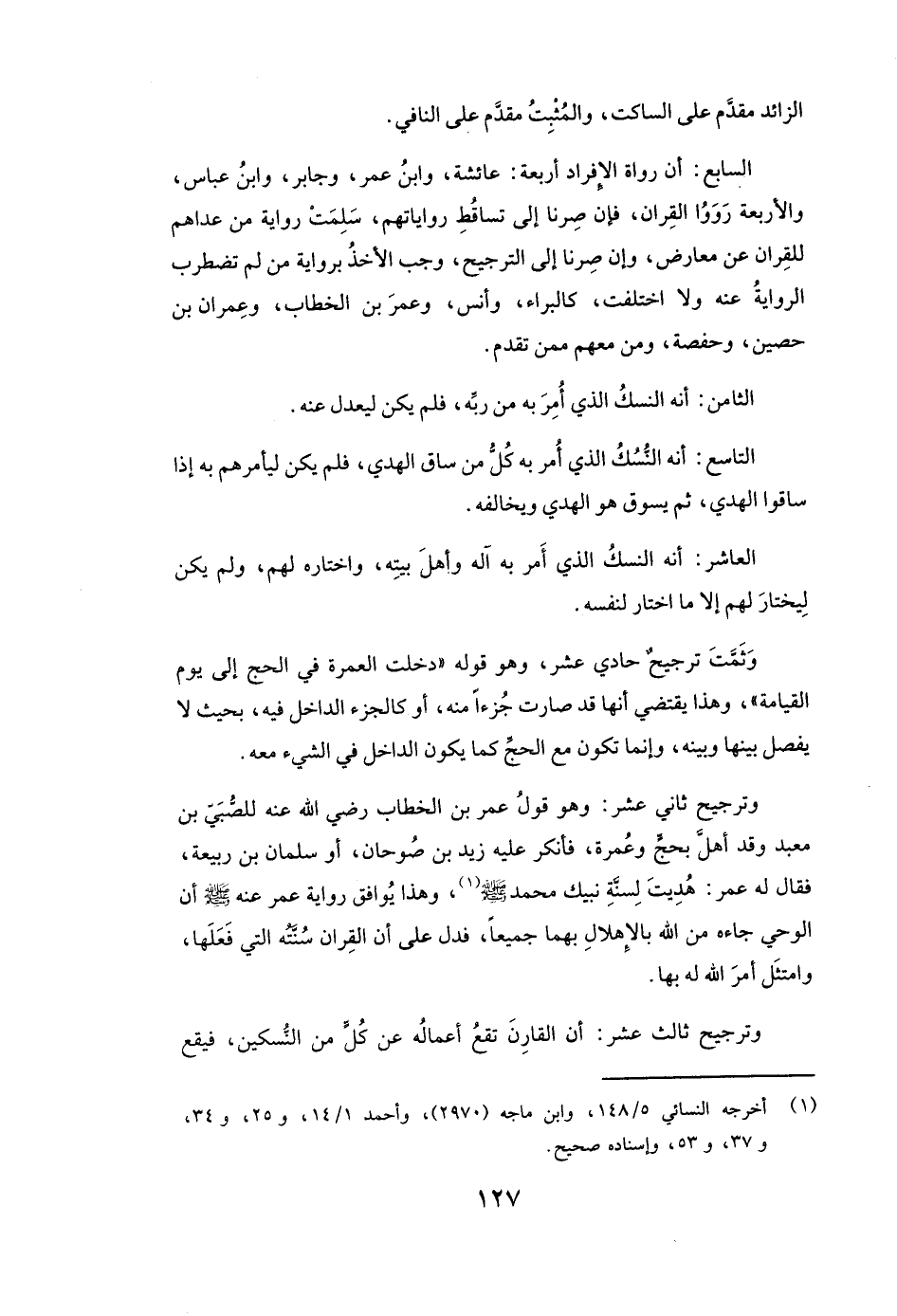 السَّابِعُ: أَنَّ رُوَاةَ الْإِفْرَادِ أَرْبَعَةٌ: عائشة، وَابْنُ عُمَرَ، وجابر، وَابْنُ عَبَّاسٍ، وَالْأَرْبَعَةُ رَوَوُا الْقِرَانَ، فَإِنْ صِرْنَا إِلَى تَسَاقُطِ رِوَايَاتِهِمْ، سَلِمَتْ رِوَايَةُ مَنْ عَدَاهُمْ لِلْقِرَانِ عَنْ مُعَارِضٍ، وَإِنْ صِرْنَا إِلَى التَّرْجِيحِ، وَجَبَ الْأَخْذُ بِرِوَايَةِ مَنْ لَمْ تَضْطَرِبِ الرِّوَايَةُ عَنْهُ، وَلَا اخْتَلَفَتْ كالبراء، وأنس، وَعُمَرَ بْنِ الْخَطَّابِ، وَعِمْرَانَ بْنِ حُصَيْنٍ، وحفصة، وَمَنْ مَعَهُمْ مِمَّنْ تَقَدَّمَ.