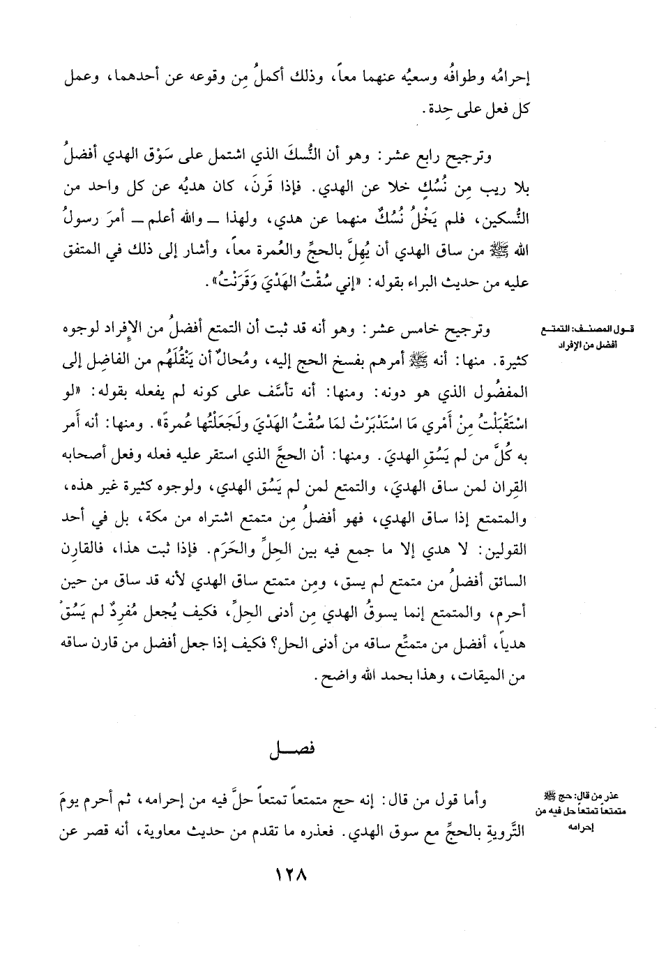 وَتَرْجِيحٌ رَابِعَ عَشَرَ: وَهُوَ أَنَّ النُّسُكَ الَّذِي اشْتَمَلَ عَلَى سَوْقِ الْهَدْيِ أَفْضَلُ بِلَا رَيْبٍ مِنْ نُسُكٍ خَلَا عَنِ الْهَدْيِ. فَإِذَا قَرَنَ، كَانَ هَدْيُهُ عَنْ كُلِّ وَاحِدٍ مِنَ النُّسُكَيْنِ، فَلَمْ يَخْلُ نُسُكٌ مِنْهُمَا عَنْ هَدْيٍ، وَلِهَذَا - وَاللَّهُ أَعْلَمُ - أَمَرَ رَسُولُ اللَّهِ - صَلَّى اللَّهُ عَلَيْهِ وَسَلَّمَ - مَنْ سَاقَ الْهَدْيَ أَنْ يُهِلَّ بِالْحَجِّ وَالْعُمْرَةِ مَعًا، وَأَشَارَ إِلَى ذَلِكَ فِي الْمُتَّفَقِ عَلَيْهِ مِنْ حَدِيثِ الْبَرَاءِ بِقَوْلِهِ: " «إِنِّي سُقْتُ الْهَدْيَ وَقَرَنْتُ» ".