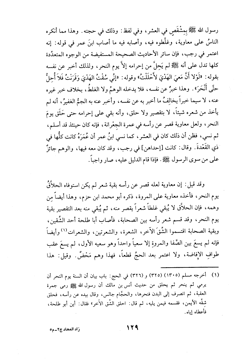 رَسُولِ اللَّهِ - صَلَّى اللَّهُ عَلَيْهِ وَسَلَّمَ - بِمِشْقَصٍ فِي الْعَشْرِ، وَفِي لَفْظٍ: وَذَلِكَ فِي حَجَّتِهِ. وَهَذَا مِمَّا أَنْكَرَهُ النَّاسُ عَلَى معاوية، وَغَلَّطُوهُ فِيهِ، وَأَصَابَهُ فِيهِ مَا أَصَابَ ابْنَ عُمَرَ فِي قَوْلِهِ: إِنَّهُ اعْتَمَرَ فِي رَجَبٍ، فَإِنَّ سَائِرَ الْأَحَادِيثِ الصَّحِيحَةِ الْمُسْتَفِيضَةِ مِنَ الْوُجُوهِ الْمُتَعَدِّدَةِ كُلَّهَا تَدُلُّ عَلَى أَنَّهُ - صَلَّى اللَّهُ عَلَيْهِ وَسَلَّمَ - لَمْ يَحِلَّ مِنْ إِحْرَامِهِ إِلَّا يَوْمَ النَّحْرِ، وَلِذَلِكَ أَخْبَرَ عَنْ نَفْسِهِ بِقَوْلِهِ: ( «لَوْلَا أَنَّ مَعِيَ الْهَدْيَ لَأَحْلَلْتُ» ) ، وَقَوْلِهِ: ( «إِنِّي سُقْتُ الْهَدْيَ وَقَرَنْتُ فَلَا أُحِلُّ حَتَّى أَنْحَرَ» ) . وَهَذَا خَبَرٌ عَنْ نَفْسِهِ، فَلَا يَدْخُلُهُ الْوَهْمُ وَلَا الْغَلَطُ، بِخِلَافِ خَبَرِ غَيْرِهِ عَنْهُ، لَا سِيَّمَا خَبَرًا يُخَالِفُ مَا أَخْبَرَ بِهِ عَنْ نَفْسِهِ، وَأَخْبَرَ عَنْهُ بِهِ الْجَمُّ الْغَفِيرُ، أَنَّهُ لَمْ يَأْخُذْ مِنْ شَعْرِهِ شَيْئًا، لَا بِتَقْصِيرٍ وَلَا حَلْقٍ، وَأَنَّهُ بَقِيَ عَلَى إِحْرَامِهِ حَتَّى حَلَقَ يَوْمَ النَّحْرِ، وَلَعَلَّ معاوية قَصَّرَ عَنْ رَأْسِهِ فِي عُمْرَةِ الْجِعْرَانَةِ، فَإِنَّهُ كَانَ حِينَئِذٍ قَدْ أَسْلَمَ، ثُمَّ نَسِيَ، فَظَنَّ أَنَّ ذَلِكَ كَانَ فِي الْعَشْرِ، كَمَا نَسِيَ ابْنُ عُمَرَ أَنَّ عُمَرَهُ كَانَتْ كُلُّهَا فِي ذِي الْقَعْدَةِ. وَقَالَ: كَانَتْ [إِحْدَاهُنَّ] فِي رَجَبٍ، وَقَدْ كَانَ مَعَهُ فِيهَا، وَالْوَهْمُ جَائِزٌ عَلَى مَنْ سِوَى الرَّسُولِ صَلَّى اللَّهُ عَلَيْهِ وَسَلَّمَ. فَإِذَا قَامَ الدَّلِيلُ عَلَيْهِ، صَارَ وَاجِبًا.