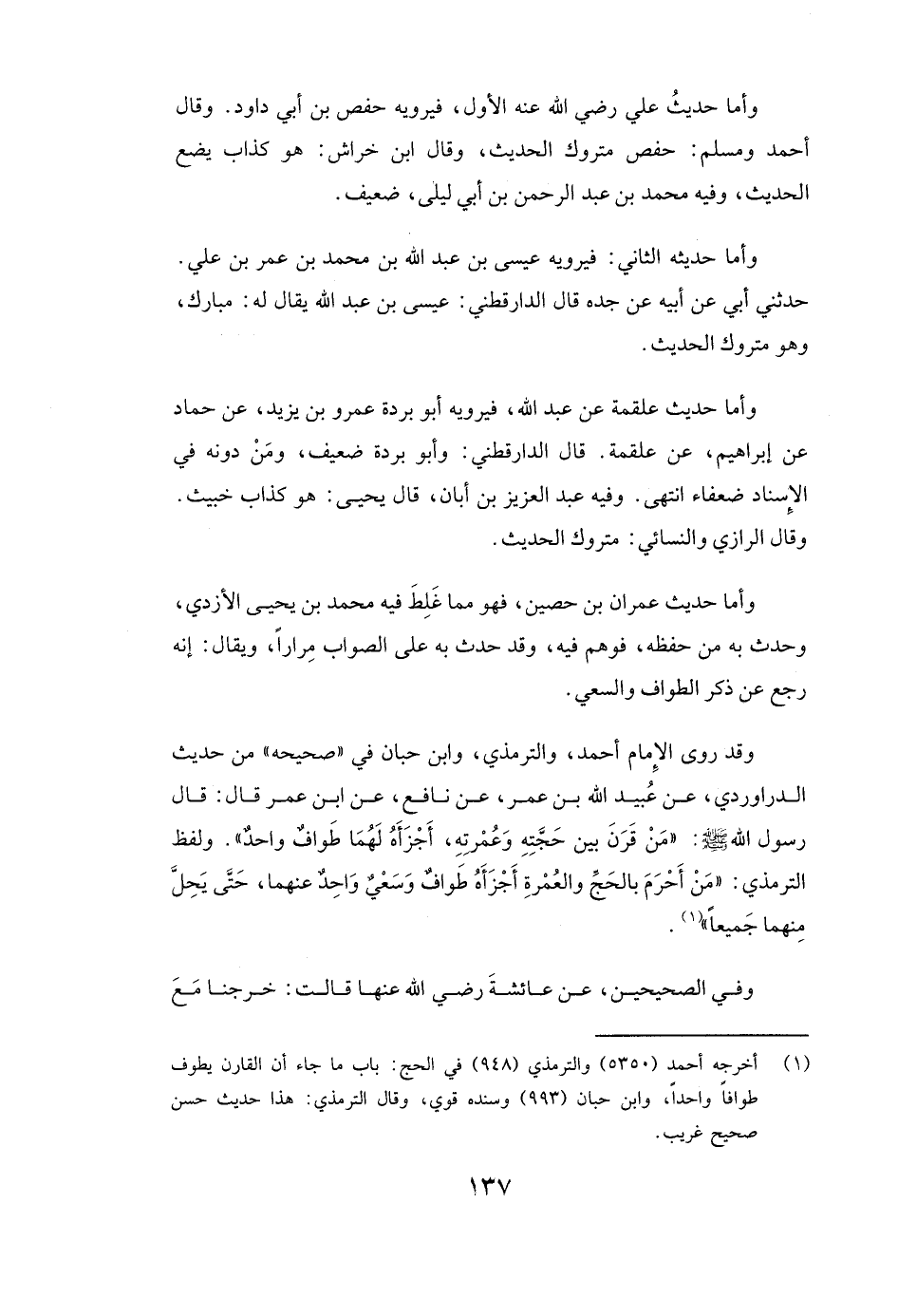 وَأَمَّا حَدِيثُ عِمْرَانَ بْنِ حُصَيْنٍ، فَهُوَ مِمَّا غَلِطَ فِيهِ محمد بن يحيى الأزدي، وَحَدَّثَ بِهِ مِنْ حِفْظِهِ، فَوَهِمَ فِيهِ، وَقَدْ حَدَّثَ بِهِ عَلَى الصَّوَابِ مِرَارًا، وَيُقَالُ: إِنَّهُ رَجَعَ عَنْ ذِكْرِ الطَّوَافِ وَالسَّعْيِ.