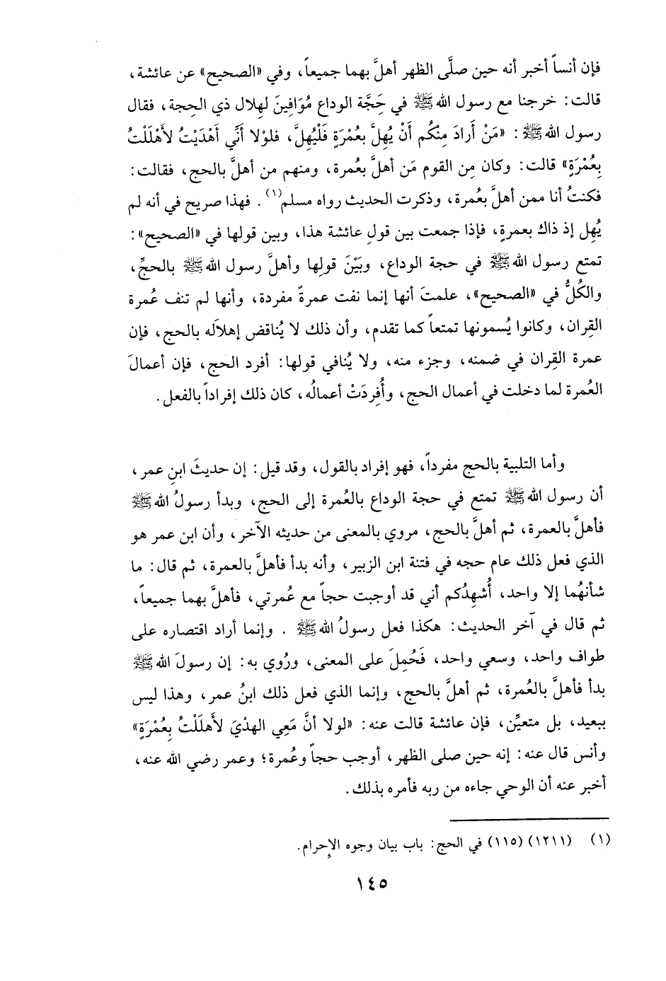 وَأَمَّا التَّلْبِيَةُ بِالْحَجِّ مُفْرَدًا، فَهُوَ إِفْرَادٌ بِالْقَوْلِ، وَقَدْ قِيلَ: إِنَّ حَدِيثَ ابْنِ عُمَرَ، «أَنَّ رَسُولَ اللَّهِ - صَلَّى اللَّهُ عَلَيْهِ وَسَلَّمَ - تَمَتَّعَ فِي حَجَّةِ الْوَدَاعِ بِالْعُمْرَةِ إِلَى الْحَجِّ، وَبَدَأَ رَسُولُ اللَّهِ - صَلَّى اللَّهُ عَلَيْهِ وَسَلَّمَ - فَأَهَلَّ بِالْعُمْرَةِ، ثُمَّ أَهَلَّ بِالْحَجِّ» ، مَرْوِيٌّ بِالْمَعْنَى مِنْ حَدِيثِهِ الْآخَرِ، وَأَنَّ ابْنَ عُمَرَ هُوَ الَّذِي فَعَلَ ذَلِكَ عَامَ حَجِّهِ فِي فِتْنَةِ ابن الزبير، وَأَنَّهُ بَدَأَ فَأَهَلَّ بِالْعُمْرَةِ، ثُمَّ قَالَ: مَا شَأْنُهُمَا إِلَّا وَاحِدٌ، أُشْهِدُكُمْ أَنِّي قَدْ أَوْجَبْتُ حَجًّا مَعَ عُمْرَتِي، فَأَهَلَّ بِهِمَا جَمِيعًا، ثُمَّ قَالَ فِي آخِرِ الْحَدِيثِ: هَكَذَا فَعَلَ رَسُولُ اللَّهِ صَلَّى اللَّهُ عَلَيْهِ وَسَلَّمَ. وَإِنَّمَا أَرَادَ اقْتِصَارَهُ عَلَى طَوَافٍ وَاحِدٍ، وَسَعْيٍ وَاحِدٍ، فَحُمِلَ عَلَى الْمَعْنَى، وَرُوِيَ بِهِ: إِنَّ رَسُولَ اللَّهِ صَلَّى اللَّهُ عَلَيْهِ وَسَلَّمَ بَدَأَ فَأَهَلَّ بِالْعُمْرَةِ، ثُمَّ أَهَلَّ بِالْحَجِّ، وَإِنَّمَا الَّذِي فَعَلَ ذَلِكَ ابْنُ عُمَرَ، وَهَذَا لَيْسَ بِبَعِيدٍ، بَلْ مُتَعَيَّنٌ، فَإِنَّ عائشة قَالَتْ عَنْهُ: " «لَوْلَا أَنَّ مَعِيَ الْهَدْيَ لَأَهْلَلْتُ بِعُمْرَةٍ» " وأنس قَالَ عَنْهُ: إِنَّهُ حِينَ صَلَّى الظُّهْرَ، أَوْجَبَ حَجًّا وَعُمْرَةً؛ وعمر رَضِيَ اللَّهُ عَنْهُ أَخْبَرَ عَنْهُ أَنَّ الْوَحْيَ جَاءَهُ مِنْ رَبِّهِ فَأَمَرَهُ بِذَلِكَ.