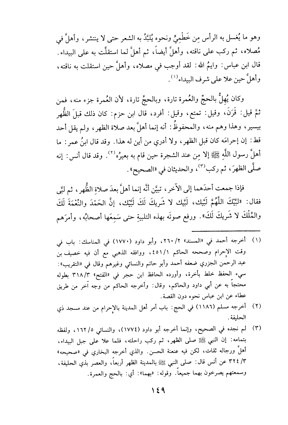 وَكَانَ يُهِلُّ بِالْحَجِّ وَالْعُمْرَةِ تَارَةً، وَبِالْحَجِّ تَارَةً؛ لِأَنَّ الْعُمْرَةَ جُزْءٌ مِنْهُ، فَمِنْ ثَمَّ قِيلَ: قَرَنَ، وَقِيلَ: تَمَتَّعَ، وَقِيلَ: أَفْرَدَ. قَالَ ابْنُ حَزْمٍ: كَانَ ذَلِكَ قَبْلَ الظُّهْرِ بِيَسِيرٍ، وَهَذَا وَهْمٌ مِنْهُ، وَالْمَحْفُوظُ أَنَّهُ إِنَّمَا أَهَلَّ بَعْدَ صَلَاةِ الظُّهْرِ، وَلَمْ يَقُلْ أَحَدٌ قَطُّ: إِنَّ إِحْرَامَهُ كَانَ قَبْلَ الظُّهْرِ، وَلَا أَدْرِي مِنْ أَيْنَ لَهُ هَذَا. وَقَدْ قَالَ ابْنُ عُمَرَ: ( «مَا أَهَلَّ رَسُولُ اللَّهِ - صَلَّى اللَّهُ عَلَيْهِ وَسَلَّمَ - إِلَّا مِنْ عِنْدِ الشَّجَرَةِ حِينَ قَامَ بِهِ بَعِيرُهُ» ) ، وَقَدْ قَالَ أنس: إِنَّهُ صَلَّى الظُّهْرَ، ثُمَّ رَكِبَ) ، وَالْحَدِيثَانِ فِي " الصَّحِيحِ ".