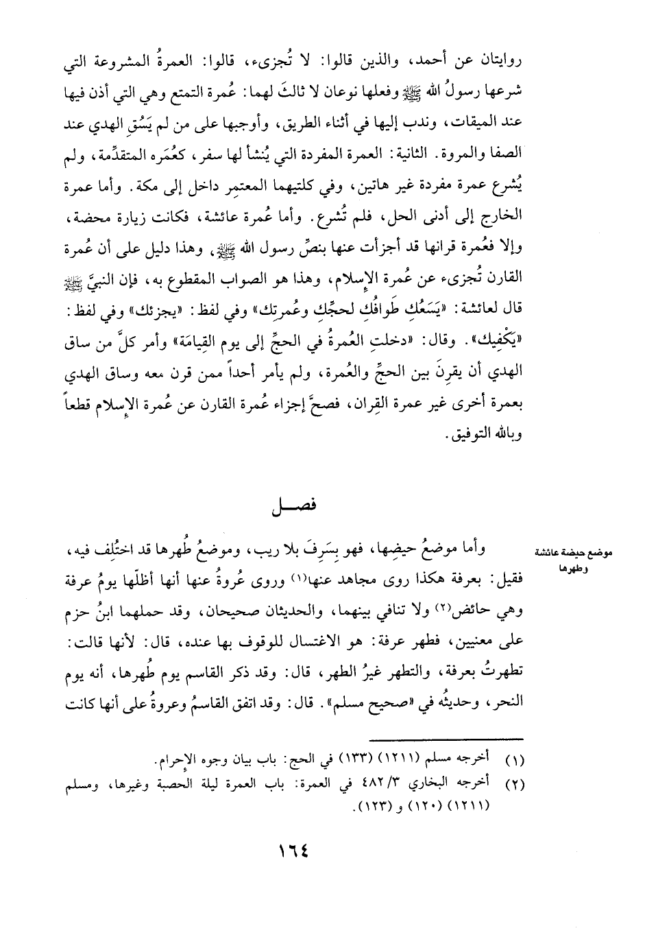 وَأَمَّا مَوْضِعُ حَيْضِهَا، فَهُوَ بِسَرِفٍ بِلَا رَيْبٍ، وَمَوْضِعُ طُهْرِهَا قَدِ اخْتُلِفَ فِيهِ، فَقِيلَ: بِعَرَفَةَ هَكَذَا رَوَى مجاهد عَنْهَا، وَرَوَى عروة عَنْهَا أَنَّهَا أَظَلَّهَا يَوْمَ عَرَفَةَ وَهِيَ حَائِضٌ وَلَا تَنَافِي بَيْنَهُمَا، وَالْحَدِيثَانِ صَحِيحَانِ، وَقَدْ حَمَلَهُمَا ابْنُ حَزْمٍ عَلَى مَعْنَيَيْنِ، فَطُهْرُ عَرَفَةَ: هُوَ الِاغْتِسَالُ لِلْوُقُوفِ بِهَا عِنْدَهُ، قَالَ: لِأَنَّهَا قَالَتْ: تَطَهَّرْتُ بِعَرَفَةَ، وَالتَّطَهُّرُ غَيْرُ الطُّهْرِ، قَالَ: وَقَدْ ذَكَرَ القاسم يَوْمَ طُهْرِهَا، أَنَّهُ يَوْمُ النَّحْرِ، وَحَدِيثُهُ فِي " صَحِيحِ مسلم ". قَالَ: وَقَدِ اتَّفَقَ القاسم وعروة عَلَى أَنَّهَا كَانَتْ