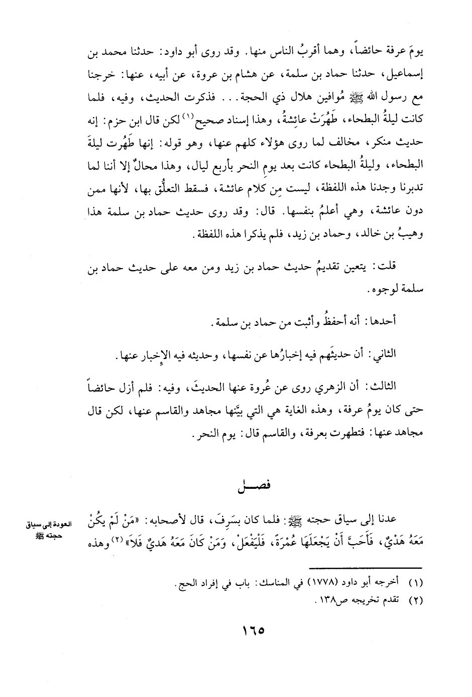 يَوْمَ عَرَفَةَ حَائِضًا، وَهُمَا أَقْرَبُ النَّاسِ مِنْهَا. وَقَدْ رَوَى أبو داود: حَدَّثَنَا مُحَمَّدُ بْنُ إِسْمَاعِيلَ، حَدَّثَنَا حَمَّادُ بْنُ سَلَمَةَ، عَنْ هِشَامِ بْنِ عُرْوَةَ، عَنْ أَبِيهِ، عَنْهَا: خَرَجْنَا مَعَ رَسُولِ اللَّهِ - صَلَّى اللَّهُ عَلَيْهِ وَسَلَّمَ - مُوَافِينَ هِلَالَ ذِي الْحِجَّةِ. .. فَذَكَرَتِ الْحَدِيثَ، وَفِيهِ فَلَمَّا كَانَتْ لَيْلَةُ الْبَطْحَاءِ، طَهُرَتْ عائشة، وَهَذَا إِسْنَادٌ صَحِيحٌ لَكِنْ قَالَ ابْنُ حَزْمٍ: إِنَّهُ حَدِيثٌ مُنْكَرٌ، مُخَالِفٌ لِمَا رَوَى هَؤُلَاءِ كُلُّهُمْ عَنْهَا، وَهُوَ قَوْلُهُ: إِنَّهَا طَهُرَتْ لَيْلَةَ الْبَطْحَاءِ، وَلَيْلَةُ الْبَطْحَاءِ كَانَتْ بَعْدَ يَوْمِ النَّحْرِ بِأَرْبَعِ لَيَالٍ، وَهَذَا مُحَالٌ إِلَّا أَنَّنَا لَمَّا تَدَبَّرْنَا وَجَدْنَا هَذِهِ اللَّفْظَةَ لَيْسَتْ مِنْ كَلَامِ عائشة، فَسَقَطَ التَّعَلُّقُ بِهَا، لِأَنَّهَا مِمَّنْ دُونَ عائشة، وَهِيَ أَعْلَمُ بِنَفْسِهَا. قَالَ: وَقَدْ رَوَى حَدِيثَ حَمَّادِ بْنِ سَلَمَةَ هَذَا وُهَيْبُ بْنُ خَالِدٍ، وَحَمَّادُ بْنُ زَيْدٍ، فَلَمْ يَذْكُرَا هَذِهِ اللَّفْظَةَ.