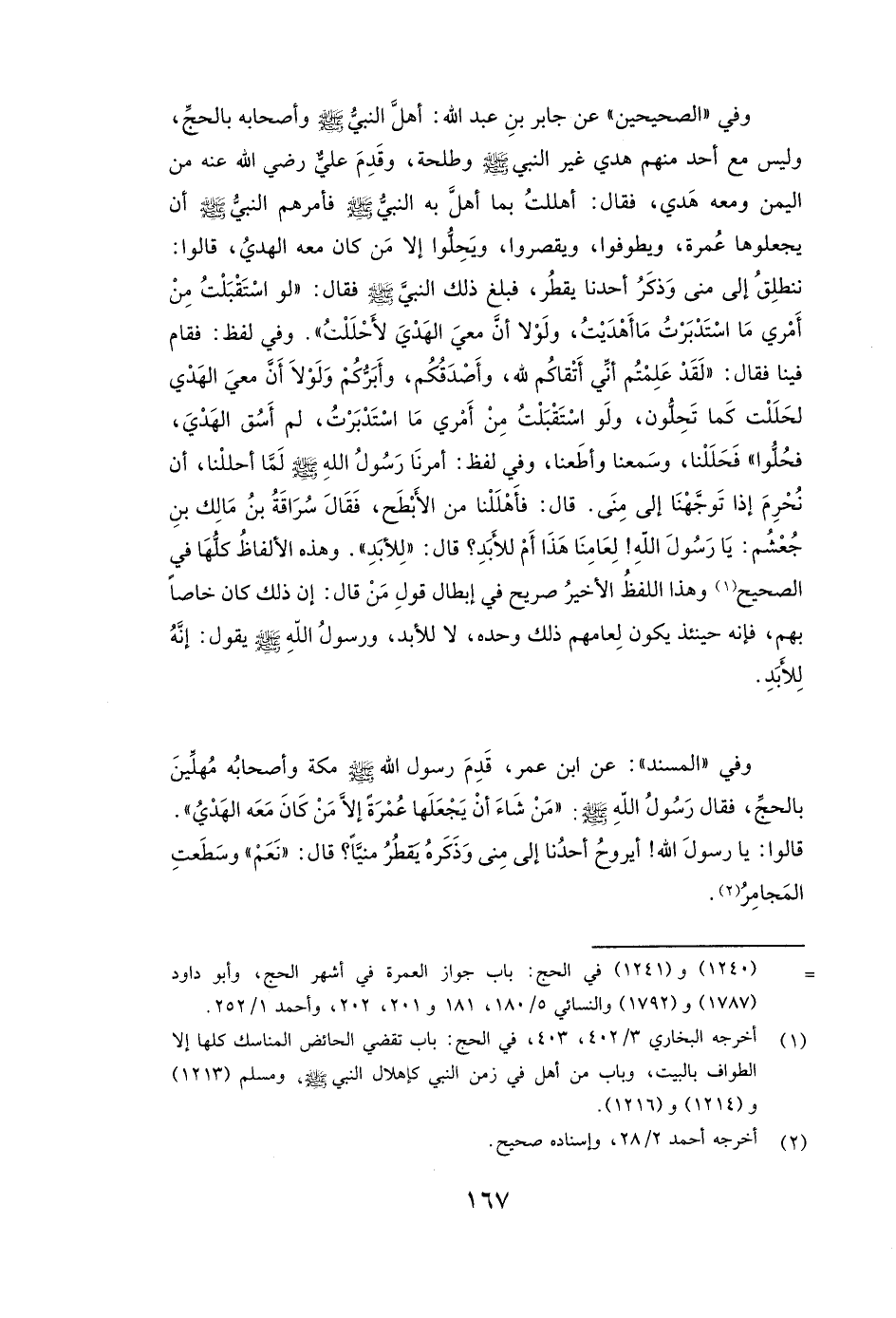 وَفِي " الصَّحِيحَيْنِ " عَنْ جَابِرِ بْنِ عَبْدِ اللَّهِ: ( «أَهَلَّ النَّبِيُّ - صَلَّى اللَّهُ عَلَيْهِ وَسَلَّمَ - وَأَصْحَابُهُ بِالْحَجِّ، وَلَيْسَ مَعَ أَحَدٍ مِنْهُمْ هَدْيٌ غَيْرَ النَّبِيِّ - صَلَّى اللَّهُ عَلَيْهِ وَسَلَّمَ - وطلحة، وَقَدِمَ علي - رَضِيَ اللَّهُ عَنْهُ - مِنَ الْيَمَنِ وَمَعَهُ هَدْيٌ، فَقَالَ أَهْلَلْتُ بِمَا أَهَلَّ بِهِ النَّبِيُّ صَلَّى اللَّهُ عَلَيْهِ وَسَلَّمَ، فَأَمَرَهُمُ النَّبِيُّ - صَلَّى اللَّهُ عَلَيْهِ وَسَلَّمَ - أَنْ يَجْعَلُوهَا عُمْرَةً، وَيَطُوفُوا، وَيُقَصِّرُوا، وَيَحِلُّوا إِلَّا مَنْ كَانَ مَعَهُ الْهَدْيُ، قَالُوا: نَنْطَلِقُ إِلَى مِنًى وَذَكَرُ أَحَدِنَا يَقْطُرُ، فَبَلَغَ ذَلِكَ النَّبِيَّ صَلَّى اللَّهُ عَلَيْهِ وَسَلَّمَ، فَقَالَ: " لَوِ اسْتَقْبَلْتُ مِنْ أَمْرِي مَا اسْتَدْبَرْتُ مَا أَهْدَيْتُ، وَلَوْلَا أَنَّ مَعِيَ الْهَدْيَ لَأَحْلَلْتُ» ) ، وَفِي لَفْظٍ: فَقَامَ فِينَا فَقَالَ: ( «لَقَدْ عَلِمْتُمْ أَنِّي أَتْقَاكُمْ لِلَّهِ وَأَصْدَقُكُمْ، وَأَبَرُّكُمْ، وَلَوْلَا أَنَّ مَعِيَ الْهَدْيَ لَحَلَلْتُ كَمَا تَحِلُّونَ، وَلَوِ اسْتَقْبَلْتُ مِنْ أَمْرِي مَا اسْتَدْبَرْتُ، لَمْ أَسُقِ الْهَدْيَ، فَحِلُّوا " فَحَلَلْنَا، وَسَمِعْنَا وَأَطَعْنَا» ) ، وَفِي لَفْظٍ: ( «أَمَرَنَا رَسُولُ اللَّهِ - صَلَّى اللَّهُ عَلَيْهِ وَسَلَّمَ - لَمَّا أَحْلَلْنَا، أَنْ نُحْرِمَ إِذَا تَوَجَّهْنَا إِلَى مِنًى. قَالَ: فَأَهْلَلْنَا مِنَ الْأَبْطَحِ، فَقَالَ سراقة بن مالك بن جعشم: يَا رَسُولَ اللَّهِ! لِعَامِنَا هَذَا أَمْ لِلْأَبَدِ؟ قَالَ لِلْأَبَدِ» ) .