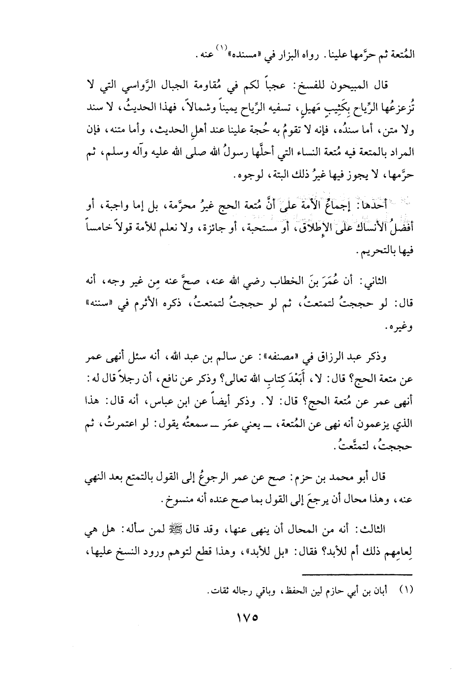 أَحَدُهَا: إِجْمَاعُ الْأُمَّةِ عَلَى أَنَّ مُتْعَةَ الْحَجِّ غَيْرُ مُحَرَّمَةٍ، بَلْ إِمَّا وَاجِبَةٌ، أَوْ أَفْضَلُ الْأَنْسَاكِ عَلَى الْإِطْلَاقِ، أَوْ مُسْتَحَبَّةٌ أَوْ جَائِزَةٌ، وَلَا نَعْلَمُ لِلْأُمَّةِ قَوْلًا خَامِسًا فِيهَا بِالتَّحْرِيمِ.