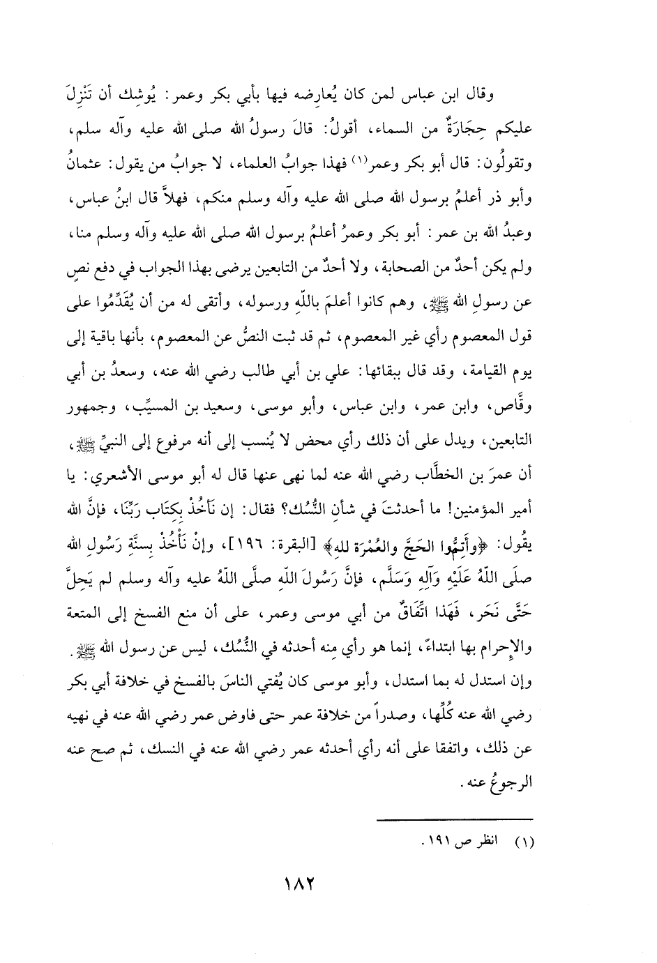 (وَقَالَ ابْنُ عَبَّاسٍ لِمَنْ كَانَ يُعَارِضُهُ فِيهَا بأبي بكر وعمر: يُوشِكُ أَنْ تَنْزِلَ عَلَيْكُمْ حِجَارَةٌ مِنَ السَّمَاءِ، أَقُولُ قَالَ رَسُولُ اللَّهِ - صَلَّى اللَّهُ عَلَيْهِ وَآلِهِ وَسَلَّمَ - وَتَقُولُونَ قَالَ أبو بكر وعمر) . فَهَذَا جَوَابُ الْعُلَمَاءِ لَا جَوَابُ مَنْ يَقُولُ عثمان وأبو ذر أَعْلَمُ بِرَسُولِ اللَّهِ - صَلَّى اللَّهُ عَلَيْهِ وَآلِهِ وَسَلَّمَ - مِنْكُمْ، فَهَلَّا قَالَ ابْنُ عَبَّاسٍ، وَعَبْدُ اللَّهِ بْنُ عُمَرَ: أبو بكر وعمر أَعْلَمُ بِرَسُولِ اللَّهِ - صَلَّى اللَّهُ عَلَيْهِ وَآلِهِ وَسَلَّمَ - مِنَّا، وَلَمْ يَكُنْ أَحَدٌ مِنَ الصَّحَابَةِ وَلَا أَحَدٌ مِنَ التَّابِعِينَ يَرْضَى بِهَذَا الْجَوَابِ فِي دَفْعِ نَصٍّ عَنْ رَسُولِ اللَّهِ صَلَّى اللَّهُ عَلَيْهِ وَسَلَّمَ، وَهُمْ كَانُوا أَعْلَمَ بِاللَّهِ وَرَسُولِهِ، وَأَتْقَى لَهُ مِنْ أَنْ يُقَدِّمُوا عَلَى قَوْلِ الْمَعْصُومِ رَأْيَ غَيْرِ الْمَعْصُومِ، ثُمَّ قَدْ ثَبَتَ النَّصُّ عَنِ الْمَعْصُومِ بِأَنَّهَا بَاقِيَةٌ إِلَى يَوْمِ الْقِيَامَةِ، وَقَدْ قَالَ بِبَقَائِهَا: عَلِيُّ بْنُ أَبِي طَالِبٍ رَضِيَ اللَّهُ عَنْهُ، وَسَعْدُ بْنُ أَبِي وَقَّاصٍ، وَابْنُ عُمَرَ، وَابْنُ عَبَّاسٍ، وأبو موسى، وَسَعِيدُ بْنُ الْمُسَيَّبِ، وَجُمْهُورُ التَّابِعِينَ