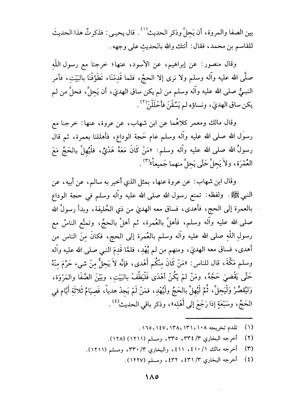 بَيْنَ الصَّفَا وَالْمَرْوَةِ أَنْ يَحِلَّ» ) ، وَذَكَرَ الْحَدِيثَ. قَالَ يحيى: فَذَكَرْتُ هَذَا الْحَدِيثَ لِلْقَاسِمِ بْنِ مُحَمَّدٍ، فَقَالَ أَتَتْكَ وَاللَّهِ بِالْحَدِيثِ عَلَى وَجْهِهِ.