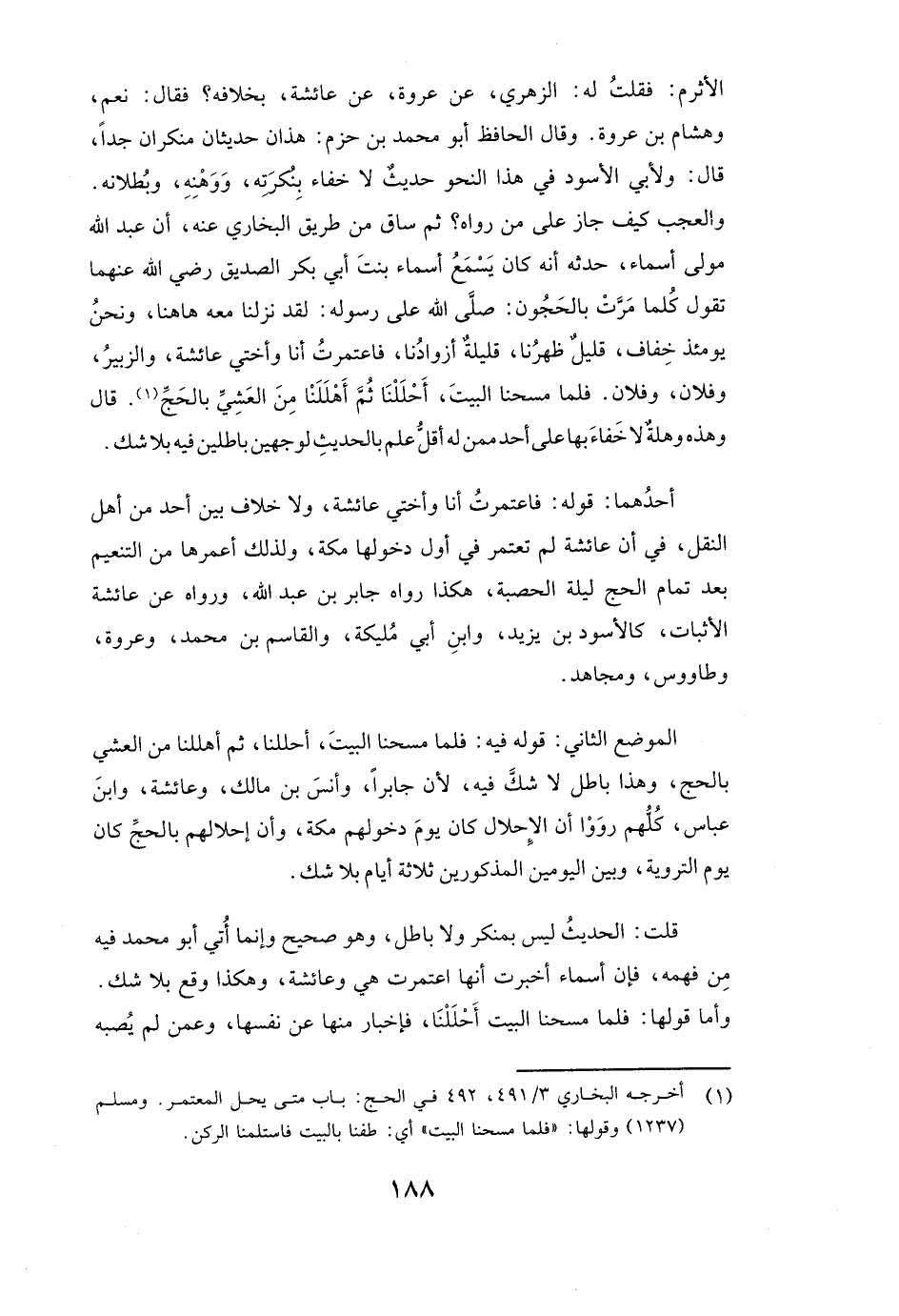 قُلْتُ: الْحَدِيثُ لَيْسَ بِمُنْكَرٍ وَلَا بَاطِلٍ، وَهُوَ صَحِيحٌ، وَإِنَّمَا أُتِيَ أبو محمد فِيهِ مِنْ فَهْمِهِ، فَإِنَّ أسماء أَخْبَرَتْ أَنَّهَا اعْتَمَرَتْ هِيَ وعائشة، وَهَكَذَا وَقَعَ بِلَا شَكٍّ. وَأَمَّا قَوْلُهَا: فَلَمَّا مَسَحْنَا الْبَيْتَ أَحْلَلْنَا، فَإِخْبَارٌ مِنْهَا عَنْ نَفْسِهَا، وَعَمَّنْ لَمْ يُصِبْهُ