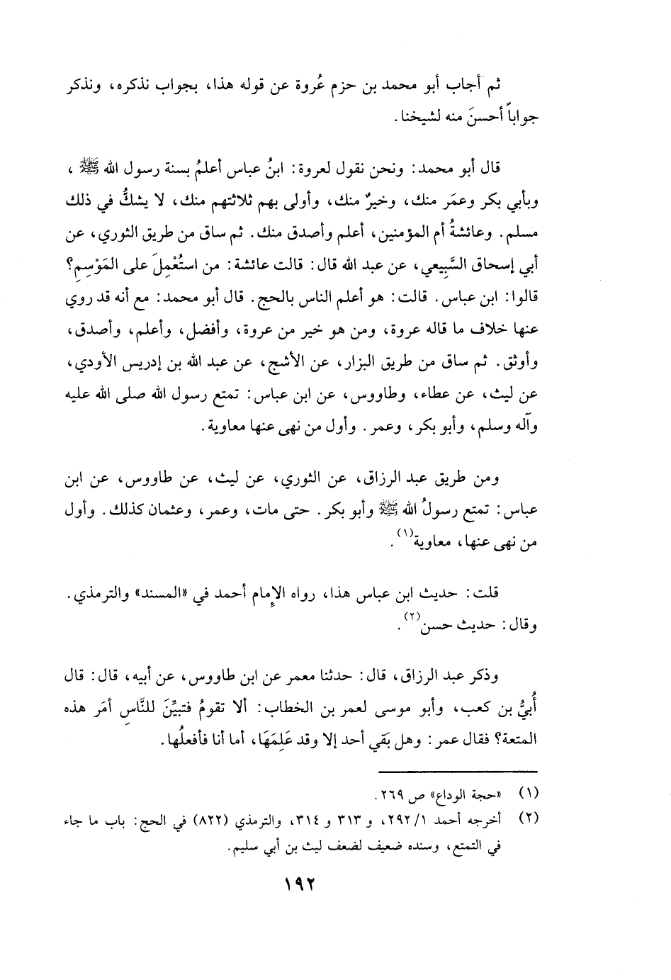 قَالَ أبو محمد مَعَ أَنَّهُ قَدْ رُوِيَ عَنْهَا خِلَافُ مَا قَالَهُ عروة، وَمَنْ هُوَ خَيْرٌ مِنْ عروة وَأَفْضَلُ، وَأَعْلَمُ، وَأَصْدَقُ، وَأَوْثَقُ. ثُمَّ سَاقَ مِنْ طَرِيقِ البزار، عَنِ الأشج، عَنْ عَبْدِ اللَّهِ بْنِ إِدْرِيسَ الْأَوْدِيِّ، عَنْ ليث، عَنْ عطاء، وطاووس، عَنِ ابْنِ عَبَّاسٍ: «تَمَتَّعَ رَسُولُ اللَّهِ صَلَّى اللَّهُ عَلَيْهِ وَآلِهِ وَسَلَّمَ، وأبو بكر، وعمر وَأَوَّلُ مَنْ نَهَى عَنْهَا معاوية» .