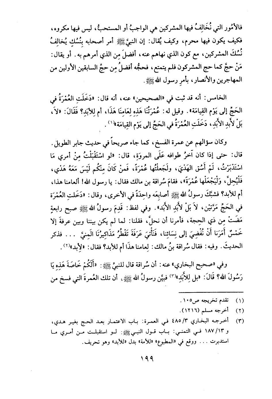 الْخَامِسُ: أَنَّهُ قَدْ ثَبَتَ فِي " الصَّحِيحَيْنِ " عَنْهُ أَنَّهُ قَالَ: " «دَخَلَتِ الْعُمْرَةُ فِي الْحَجِّ إِلَى يَوْمِ الْقِيَامَةِ» ". «وَقِيلَ لَهُ عُمْرَتُنَا هَذِهِ لِعَامِنَا هَذَا، أَمْ لِلْأَبَدِ؟ فَقَالَ: " لَا، بَلْ لِأَبَدِ الْأَبَدِ، دَخَلَتِ الْعُمْرَةُ فِي الْحَجِّ إِلَى يَوْمِ الْقِيَامَةِ» ".