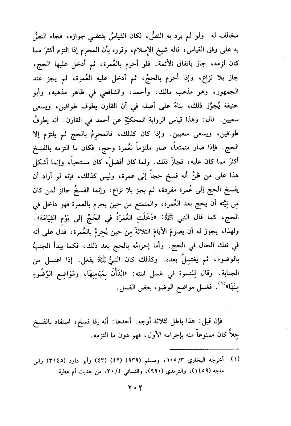 وَلَمَّا كَانَ أَفْضَلَ، كَانَ مُسْتَحَبًّا، وَإِنَّمَا أَشْكَلَ هَذَا عَلَى مَنْ ظَنَّ أَنَّهُ فَسَخَ حَجًّا إِلَى عُمْرَةٍ، وَلَيْسَ كَذَلِكَ فَإِنَّهُ لَوْ أَرَادَ أَنْ يَفْسَخَ الْحَجَّ إِلَى عُمْرَةٍ مُفْرَدَةٍ لَمْ يَجُزْ بِلَا نِزَاعٍ، وَإِنَّمَا الْفَسْخُ جَائِزٌ لِمَنْ كَانَ مِنْ نِيَّتِهِ أَنْ يَحُجَّ بَعْدَ الْعُمْرَةِ، وَالْمُتَمَتِّعُ مِنْ حِينِ يُحْرِمُ بِالْعُمْرَةِ فَهُوَ دَاخِلٌ فِي الْحَجِّ، كَمَا قَالَ النَّبِيُّ - صَلَّى اللَّهُ عَلَيْهِ وَسَلَّمَ -: " «دَخَلَتِ الْعُمْرَةُ فِي الْحَجِّ إِلَى يَوْمِ الْقِيَامَةِ» " وَلِهَذَا، يَجُوزُ لَهُ أَنْ يَصُومَ الْأَيَّامَ الثَّلَاثَةَ مِنْ حِينِ يُحْرِمُ بِالْعُمْرَةِ، فَدَلَّ عَلَى أَنَّهُ فِي تِلْكَ الْحَالِ فِي الْحَجِّ. وَأَمَّا إِحْرَامُهُ بِالْحَجِّ بَعْدَ ذَلِكَ، فَكَمَا يَبْدَأُ الْجُنُبُ بِالْوُضُوءِ، ثُمَّ يَغْتَسِلُ بَعْدَهُ.