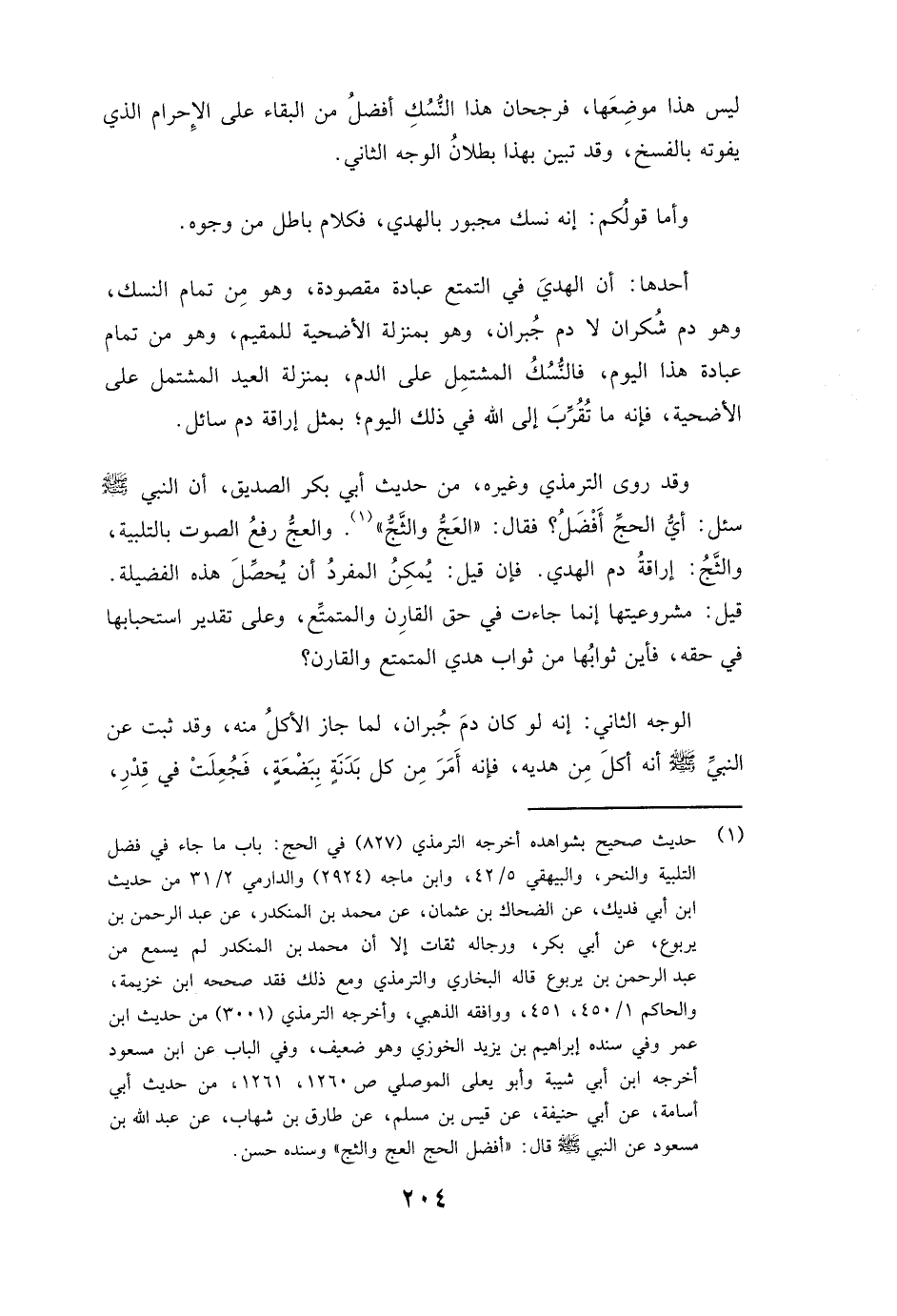 وَقَدْ رَوَى الترمذي وَغَيْرُهُ مِنْ حَدِيثِ أَبِي بَكْرٍ الصِّدِّيقِ، «أَنَّ النَّبِيَّ - صَلَّى اللَّهُ عَلَيْهِ وَسَلَّمَ - سُئِلَ: أَيُّ الْحَجِّ أَفْضَلُ؟ فَقَالَ: " الْعَجُّ وَالثَّجُّ» . وَالْعَجُّ: رَفْعُ الصَّوْتِ بِالتَّلْبِيَةِ، وَالثَّجُّ: إِرَاقَةُ دَمِ الْهَدْيِ. فَإِنْ قِيلَ: يُمْكِنُ الْمُفْرِدُ أَنْ يُحَصِّلَ هَذِهِ الْفَضِيلَةَ. قِيلَ: مَشْرُوعِيُّتُهَا إِنَّمَا جَاءَتْ فِي حَقِّ الْقَارِنِ وَالْمُتَمَتِّعِ، وَعَلَى تَقْدِيرِ اسْتِحْبَابِهَا فِي حَقِّهِ، فَأَيْنَ ثَوَابُهَا مِنْ ثَوَابِ هَدْيِ الْمُتَمَتِّعِ وَالْقَارِنِ؟