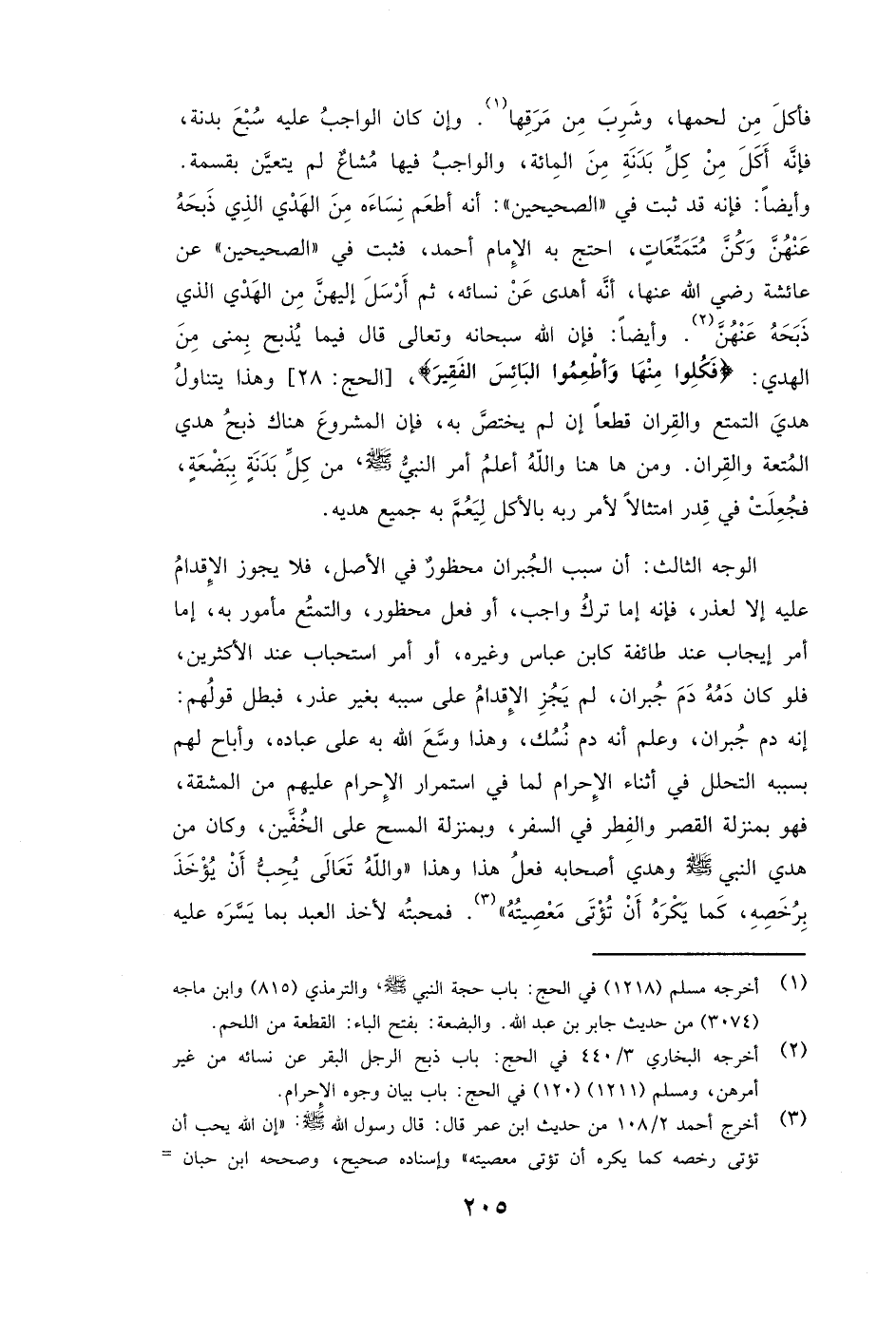 الْوَجْهُ الثَّالِثُ: أَنَّ سَبَبَ الْجُبْرَانِ مَحْظُورٌ فِي الْأَصْلِ، فَلَا يَجُوزُ الْإِقْدَامُ عَلَيْهِ إِلَّا لِعُذْرٍ، فَإِنَّهُ إِمَّا تَرْكُ وَاجِبٍ، أَوْ فِعْلُ مَحْظُورٍ، وَالتَّمَتُّعُ مَأْمُورٌ بِهِ، إِمَّا أَمْرَ إِيجَابٍ عِنْدَ طَائِفَةٍ كَابْنِ عَبَّاسٍ وَغَيْرِهِ، أَوْ أَمْرَ اسْتِحْبَابٍ عِنْدَ الْأَكْثَرِينَ، فَلَوْ كَانَ دَمُهُ دَمَ جُبْرَانٍ، لَمْ يَجُزِ الْإِقْدَامُ عَلَى سَبَبِهِ بِغَيْرِ عُذْرٍ، فَبَطَلَ قَوْلُهُمْ إِنَّهُ دَمُ جُبْرَانٍ، وَعُلِمَ أَنَّهُ دَمُ نُسُكٍ، وَهَذَا وَسَّعَ اللَّهُ بِهِ عَلَى عِبَادِهِ، وَأَبَاحَ لَهُمْ بِسَبَبِهِ التَّحَلُّلَ فِي أَثْنَاءِ الْإِحْرَامِ لِمَا فِي اسْتِمْرَارِ الْإِحْرَامِ عَلَيْهِمْ مِنَ الْمَشَقَّةِ، فَهُوَ بِمَنْزِلَةِ الْقَصْرِ وَالْفِطْرِ فِي السَّفَرِ، وَبِمَنْزِلَةِ الْمَسْحِ عَلَى الْخُفَّيْنِ، وَكَانَ مِنْ هَدْيِ النَّبِيِّ - صَلَّى اللَّهُ عَلَيْهِ وَسَلَّمَ -، وَهَدْيِ أَصْحَابِهِ فِعْلُ هَذَا وَهَذَا، " «وَاللَّهُ تَعَالَى يُحِبُّ أَنْ يُؤْخَذَ بِرُخَصِهِ، كَمَا يَكْرَهُ أَنْ تُؤْتَى مَعْصِيَتُهُ» ". فَمَحَبَّتُهُ لِأَخْذِ الْعَبْدِ بِمَا يَسَّرَهُ عَلَيْهِ