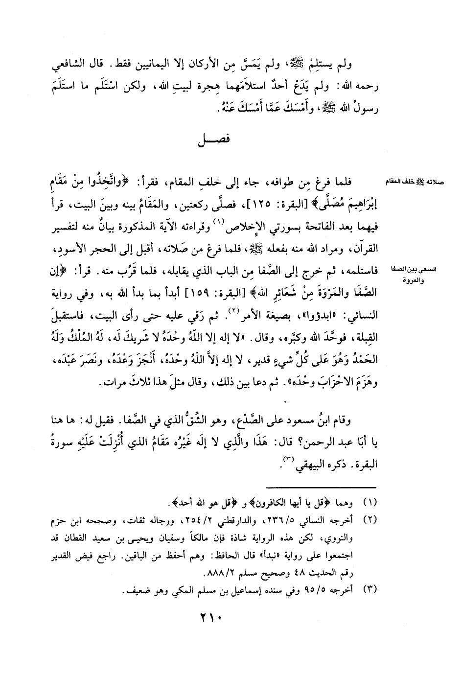 فَلَمَّا فَرَغَ مِنْ طَوَافِهِ، جَاءَ إِلَى خَلْفِ الْمَقَامِ فَقَرَأَ: {وَاتَّخِذُوا مِنْ مَقَامِ إِبْرَاهِيمَ مُصَلًّى} [البقرة: 125] [الْبَقَرَةُ 125] ، فَصَلَّى رَكْعَتَيْنِ وَالْمَقَامُ بَيْنَهُ وَبَيْنَ الْبَيْتِ، قَرَأَ فِيهِمَا بَعْدَ الْفَاتِحَةِ بِسُورَتَيِ الْإِخْلَاصِ وَقِرَاءَتُهُ الْآيَةَ الْمَذْكُورَةَ بَيَانٌ مِنْهُ لِتَفْسِيرِ الْقُرْآنِ، وَمُرَادُ اللَّهِ مِنْهُ بِفِعْلِهِ - صَلَّى اللَّهُ عَلَيْهِ وَسَلَّمَ -، فَلَمَّا فَرَغَ مِنْ صَلَاتِهِ أَقْبَلَ إِلَى الْحَجَرِ الْأَسْوَدِ فَاسْتَلَمَهُ، ثُمَّ خَرَجَ إِلَى الصَّفَا مِنَ الْبَابِ الَّذِي يُقَابِلُهُ، فَلَمَّا قَرُبَ مِنْهُ. قَرَأَ: {إِنَّ الصَّفَا وَالْمَرْوَةَ مِنْ شَعَائِرِ اللَّهِ} [البقرة: 158] [الْبَقَرَةِ 159] أَبْدَأُ بِمَا بَدَأَ اللَّهُ بِهِ، وَفِي رِوَايَةِ النَّسَائِيِّ: " ابْدَءُوا " بِصِيغَةِ الْأَمْرِ، «ثُمَّ رَقِيَ عَلَيْهِ حَتَّى رَأَى الْبَيْتَ، فَاسْتَقْبَلَ الْقِبْلَةَ فَوَحَّدَ اللَّهَ وَكَبَّرَهُ، وَقَالَ: " لَا إِلَهَ إِلَّا اللَّهُ وَحْدَهُ لَا شَرِيكَ لَهُ، لَهُ الْمُلْكُ وَلَهُ الْحَمْدُ، وَهُوَ عَلَى كُلِّ شَيْءٍ قَدِيرٌ، لَا إِلَهَ إِلَّا اللَّهُ وَحْدَهُ، أَنْجَزَ وَعْدَهُ، وَنَصَرَ عَبْدَهُ، وَهَزَمَ الْأَحْزَابَ وَحْدَهُ» ". ثُمَّ دَعَا بَيْنَ ذَلِكَ، وَقَالَ مِثْلَ هَذَا ثَلَاثَ مَرَّاتٍ.