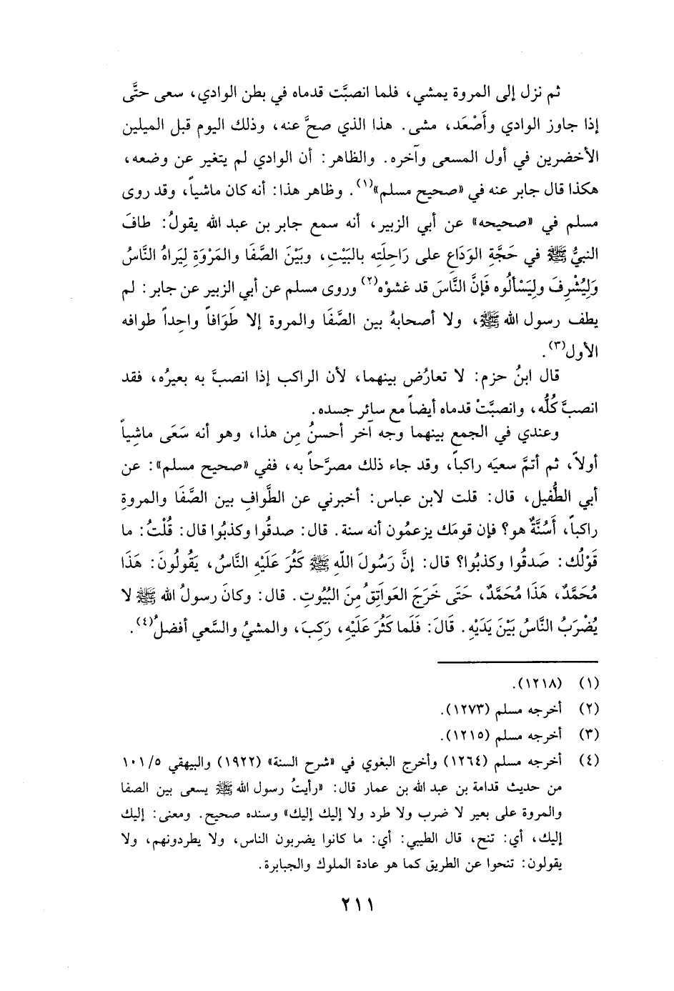 وَالظَّاهِرُ: أَنَّ الْوَادِيَ لَمْ يَتَغَيَّرْ عَنْ وَضْعِهِ هَكَذَا قَالَ جابر عَنْهُ فِي " صَحِيحِ مسلم "، وَظَاهِرُ هَذَا: أَنَّهُ كَانَ مَاشِيًا، وَقَدْ رَوَى مسلم فِي " صَحِيحِهِ " عَنْ أبي الزبير، أَنَّهُ سَمِعَ جَابِرَ بْنَ عَبْدِ اللَّهِ يَقُولُ: «طَافَ النَّبِيُّ - صَلَّى اللَّهُ عَلَيْهِ وَسَلَّمَ - فِي حَجَّةِ الْوَدَاعِ عَلَى رَاحِلَتِهِ بِالْبَيْتِ وَبَيْنَ الصَّفَا وَالْمَرْوَةِ؛ لِيَرَاهُ النَّاسُ، وَلِيُشْرِفَ، وَلِيَسْأَلُوهُ، فَإِنَّ النَّاسَ قَدْ غَشُوهُ» .