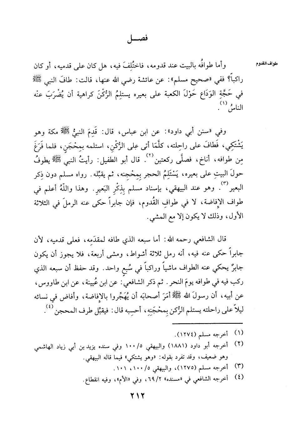 وَفِي " سُنَنِ أبي داود ": عَنِ ابْنِ عَبَّاسٍ، قَالَ: «قَدِمَ النَّبِيُّ - صَلَّى اللَّهُ عَلَيْهِ وَسَلَّمَ - مَكَّةَ وَهُوَ يَشْتَكِي، فَطَافَ عَلَى رَاحِلَتِهِ، كُلَّمَا أَتَى عَلَى الرُّكْنِ اسْتَلَمَهُ بِمِحْجَنٍ، فَلَمَّا فَرَغَ مِنْ طَوَافِهِ أَنَاخَ فَصَلَّى رَكْعَتَيْنِ» ، قَالَ أبو الطفيل: «رَأَيْتُ النَّبِيَّ - صَلَّى اللَّهُ عَلَيْهِ وَسَلَّمَ - يَطُوفُ حَوْلَ الْبَيْتِ عَلَى بَعِيرِهِ يَسْتَلِمُ الْحَجَرَ بِمِحْجَنِهِ، ثُمَّ يُقَبِّلُهُ» ، رَوَاهُ مسلم دُونَ ذِكْرِ الْبَعِيرِ، وَهُوَ عِنْدَ البيهقي، بِإِسْنَادِ مسلم بِذِكْرِ الْبَعِيرِ، وَهَذَا وَاللَّهُ أَعْلَمُ فِي طَوَافِ الْإِفَاضَةِ لَا فِي طَوَافِ الْقُدُومِ، فَإِنَّ جابرا حَكَى عَنْهُ الرَّمَلَ فِي الثَّلَاثَةِ الْأُوَلِ وَذَلِكَ لَا يَكُونُ إِلَّا مَعَ الْمَشْيِ.