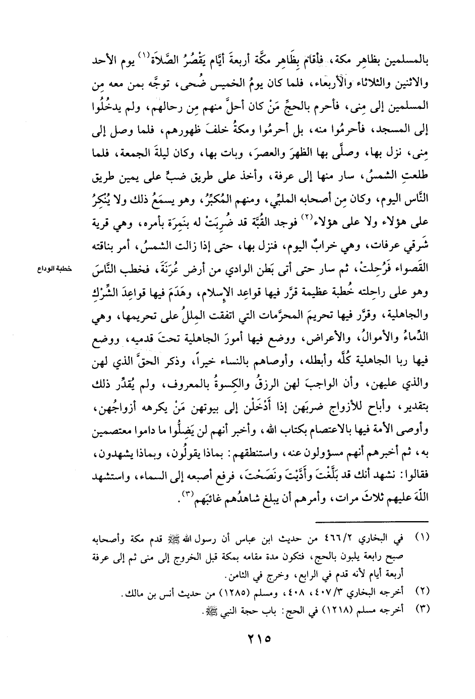 بِالْمُسْلِمِينَ بِظَاهِرِ مَكَّةَ، فَأَقَامَ بِظَاهِرِ مَكَّةَ أَرْبَعَةَ أَيَّامٍ يَقْصُرُ الصَّلَاةَ يَوْمَ الْأَحَدِ وَالِاثْنَيْنِ وَالثُّلَاثَاءِ وَالْأَرْبِعَاءِ، فَلَمَّا كَانَ يَوْمُ الْخَمِيسِ ضُحًى، تَوَجَّهَ بِمَنْ مَعَهُ مِنَ الْمُسْلِمِينَ إِلَى مِنًى، فَأَحْرَمَ بِالْحَجِّ مَنْ كَانَ أَحَلَّ مِنْهُمْ مِنْ رِحَالِهِمْ، وَلَمْ يَدْخُلُوا إِلَى الْمَسْجِدِ فَأَحْرَمُوا مِنْهُ، بَلْ أَحْرَمُوا وَمَكَّةُ خَلْفَ ظُهُورِهِمْ، فَلَمَّا وَصَلَ إِلَى مِنًى نَزَلَ بِهَا، وَصَلَّى بِهَا الظُّهْرَ وَالْعَصْرَ وَبَاتَ بِهَا، وَكَانَ لَيْلَةَ الْجُمُعَةِ فَلَمَّا طَلَعَتِ الشَّمْسُ سَارَ مِنْهَا إِلَى عَرَفَةَ، وَأَخَذَ عَلَى طَرِيقِ ضَبٍّ عَلَى يَمِينِ طَرِيقِ النَّاسِ الْيَوْمَ، وَكَانَ مِنْ أَصْحَابِهِ الْمُلَبِّي، وَمِنْهُمُ الْمُكَبِّرُ، وَهُوَ يَسْمَعُ ذَلِكَ وَلَا يُنْكِرُ عَلَى هَؤُلَاءِ وَلَا عَلَى هَؤُلَاءِ، فَوَجَدَ الْقُبَّةَ قَدْ ضُرِبَتْ لَهُ بِنَمِرَةَ بِأَمْرِهِ، وَهِيَ قَرْيَةٌ شَرْقِيَّ عَرَفَاتٍ، وَهِيَ خَرَابٌ الْيَوْمَ، فَنَزَلَ بِهَا حَتَّى إِذَا زَالَتِ الشَّمْسُ، أَمَرَ بِنَاقَتِهِ الْقَصْوَاءِ فَرُحِلَتْ، ثُمَّ سَارَ حَتَّى أَتَى بَطْنَ الْوَادِي مِنْ أَرْضِ عُرَنَةَ، فَخَطَبَ النَّاسَ وَهُوَ عَلَى رَاحِلَتِهِ خُطْبَةً عَظِيمَةً، قَرَّرَ فِيهَا قَوَاعِدَ الْإِسْلَامِ، وَهَدَمَ فِيهَا قَوَاعِدَ الشِّرْكِ وَالْجَاهِلِيَّةِ، وَقَرَّرَ فِيهَا تَحْرِيمَ الْمُحَرَّمَاتِ الَّتِي اتِّفَقَتِ الْمِلَلُ عَلَى تَحْرِيمِهَا، وَهِيَ الدِّمَاءُ، وَالْأَمْوَالُ، وَالْأَعْرَاضُ، وَوَضَعَ فِيهَا أُمُورَ الْجَاهِلِيَّةِ تَحْتَ قَدَمَيْهِ، وَوَضَعَ فِيهَا رِبَا الْجَاهِلِيَّةِ كُلَّهُ، وَأَبْطَلَهُ، وَأَوْصَاهُمْ بِالنِّسَاءِ خَيْرًا، وَذَكَرَ الْحَقَّ، الَّذِي لَهُنَّ، وَالَّذِي عَلَيْهِنَّ، وَأَنَّ الْوَاجِبَ لَهُنَّ الرِّزْقُ، وَالْكِسْوَةُ بِالْمَعْرُوفِ، وَلَمْ يُقَدِّرْ ذَلِكَ بِتَقْدِيرٍ، وَأَبَاحَ لِلْأَزْوَاجِ ضَرْبَهُنَّ إِذَا أَدْخَلْنَ إِلَى بُيُوتِهِنَّ مَنْ يَكْرَهُهُ أَزْوَاجُهُنَّ، وَأَوْصَى الْأُمَّةَ فِيهَا بِالِاعْتِصَامِ بِكِتَابِ اللَّهِ، وَأَخْبَرَ أَنَّهُمْ لَنْ يَضِلُّوا مَا دَامُوا مُعْتَصِمِينَ بِهِ، ثُمَّ أَخْبَرَهُمْ أَنَّهُمْ مَسْئُولُونَ عَنْهُ، وَاسْتَنْطَقَهُمْ: بِمَاذَا يَقُولُونَ، وَبِمَاذَا يَشْهَدُونَ، فَقَالُوا: نَشْهَدُ أَنَّكَ قَدْ بَلَّغْتَ، وَأَدَّيْتَ، وَنَصَحْتَ فَرَفَعَ أُصْبُعَهُ إِلَى السَّمَاءِ، وَاسْتَشْهَدَ اللَّهَ عَلَيْهِمْ ثَلَاثَ مَرَّاتٍ، وَأَمَرَهُمْ أَنْ يُبَلِّغَ شَاهِدُهُمْ غَائِبَهُمْ.