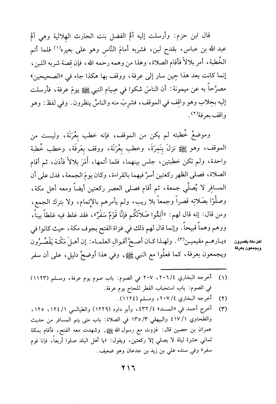 وَلِهَذَا كَانَ أَصَحُّ أَقْوَالِ الْعُلَمَاءِ: إِنَّ أَهْلَ مَكَّةَ يَقْصُرُونَ وَيَجْمَعُونَ بِعَرَفَةَ، كَمَا فَعَلُوا مَعَ النَّبِيِّ - صَلَّى اللَّهُ عَلَيْهِ وَسَلَّمَ - وَفِي هَذَا أَوْضَحُ دَلِيلٍ عَلَى أَنَّ سَفَرَ