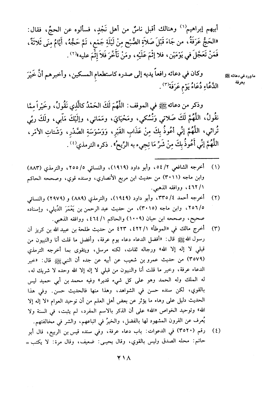 أَبِيهِمْ إِبْرَاهِيمَ، وَهُنَالِكَ أَقْبَلَ نَاسٌ مِنْ أَهْلِ نَجْدٍ، فَسَأَلُوهُ عَنِ الْحَجِّ، فَقَالَ: " «الْحَجُّ عَرَفَةُ، مَنْ جَاءَ قَبْلَ صَلَاةِ الصُّبْحِ مِنْ لَيْلَةِ جَمْعٍ، تَمَّ حَجُّهُ، أَيَّامُ مِنًى ثَلَاثَةٌ، فَمَنْ تَعَجَّلَ فِي يَوْمَيْنِ، فَلَا إِثْمَ عَلَيْهِ، وَمَنْ تَأَخَّرَ فَلَا إِثْمَ عَلَيْهِ» ".
