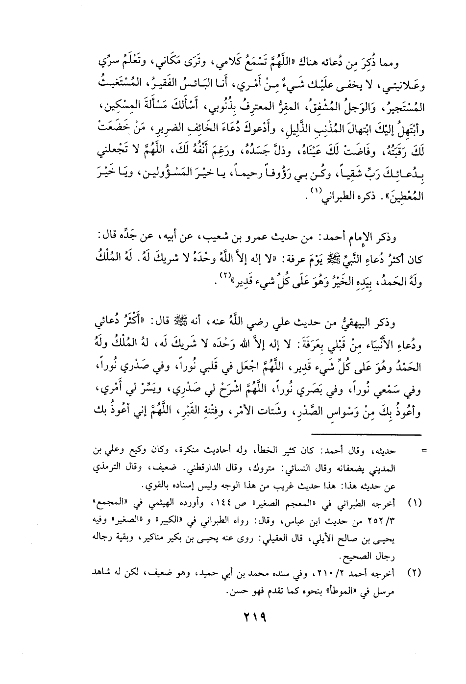 وَذَكَرَ البيهقي مِنْ حَدِيثِ علي - رَضِيَ اللَّهُ عَنْهُ - أَنَّهُ - صَلَّى اللَّهُ عَلَيْهِ وَسَلَّمَ - قَالَ: ( «أَكْثَرُ دُعَائِي وَدُعَاءِ الْأَنْبِيَاءِ مِنْ قَبْلِي بِعَرَفَةَ: لَا إِلَهَ إِلَّا اللَّهُ وَحْدَهُ لَا شَرِيكَ لَهُ، لَهُ الْمُلْكُ، وَلَهُ الْحَمْدُ، وَهُوَ عَلَى كُلِّ شَيْءٍ قَدِيرٌ اللَّهُمَّ اجْعَلْ فِي قَلْبِي نُورًا، وَفِي صَدْرِي نُورًا، وَفِي سَمْعِي نُورًا، وَفِي بَصَرِي نُورًا، اللَّهُمَّ اشْرَحْ لِي صَدْرِي، وَيَسِّرْ لِي أَمْرِي، وَأَعُوذُ بِكَ مِنْ وَسْوَاسِ الصَّدْرِ، وَشَتَاتِ الْأَمْرِ، وَفِتْنَةِ الْقَبْرِ، اللَّهُمَّ إِنِّي أَعُوذُ بِكَ