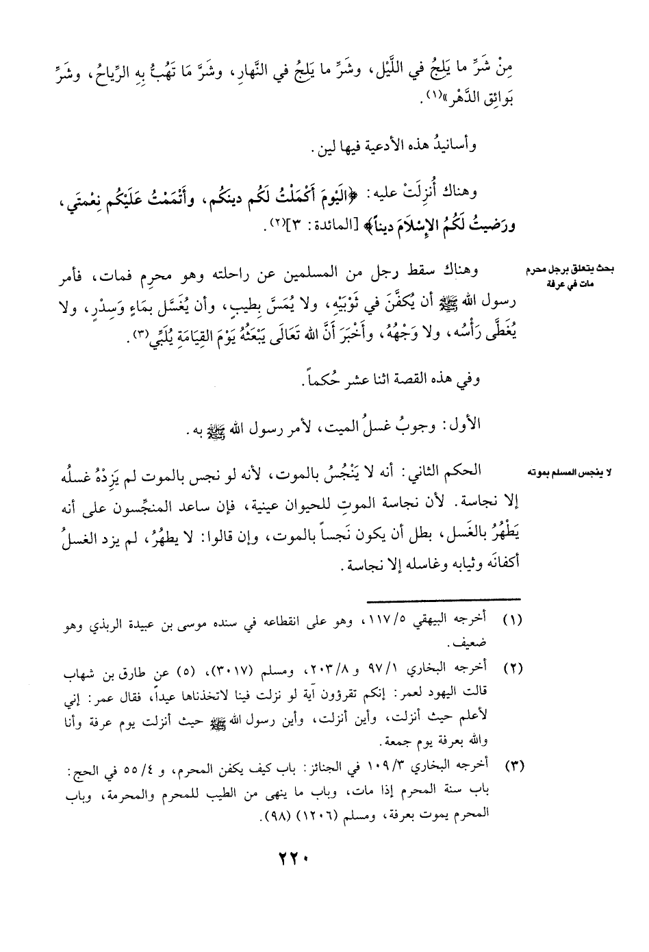 وَهُنَاكَ سَقَطَ رَجُلٌ مِنَ الْمُسْلِمِينَ عَنْ رَاحِلَتِهِ، وَهُوَ مُحْرِمٌ، فَمَاتَ، فَأَمَرَ رَسُولُ اللَّهِ - صَلَّى اللَّهُ عَلَيْهِ وَسَلَّمَ - أَنْ يُكَفَّنَ فِي ثْوْبَيْهِ، وَلَا يُمَسَّ بِطِيبٍ، وَأَنْ يُغَسَّلَ بِمَاءٍ، وَسِدْرٍ، وَلَا يُغَطَّى رَأْسُهُ، وَلَا وَجْهُهُ، وَأَخْبَرَ أَنَّ اللَّهَ تَعَالَى يَبْعَثُهُ يَوْمَ الْقِيَامَةِ يُلَبِّي.