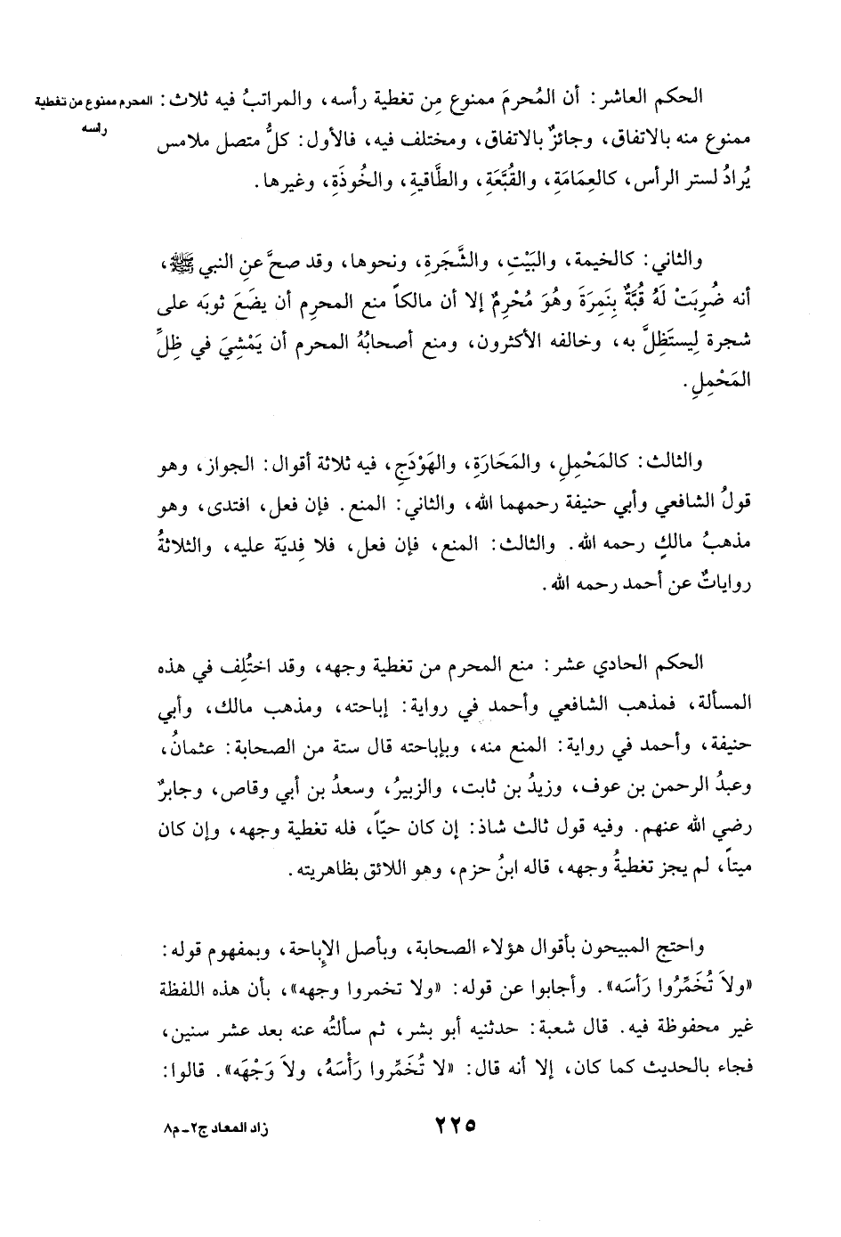 الْحُكْمُ الْحَادِيَ عَشَرَ: مَنْعُ الْمُحْرِمِ مِنْ تَغْطِيَةِ وَجْهِهِ، وَقَدِ اخْتُلِفَ فِي هَذِهِ الْمَسْأَلَةِ، فَمَذْهَبُ الشَّافِعِيِّ، وأحمد فِي رِوَايَةٍ إِبَاحَتُهُ وَمَذْهَبُ مالك، وأبي حنيفة، وأحمد فِي رِوَايَةٍ الْمَنْعُ، مِنْهُ وَبِإِبَاحَتِهِ قَالَ سِتَّةٌ مِنَ الصَّحَابَةِ عثمان، وَعَبْدُ الرَّحْمَنِ بْنُ عَوْفٍ، وَزَيْدُ بْنُ ثَابِتٍ، والزبير، وَسَعْدُ بْنُ أَبِي وَقَّاصٍ، وجابر - رَضِيَ اللَّهُ عَنْهُمْ -. وَفِيهِ قَوْلٌ ثَالِثٌ شَاذٌّ: إِنْ كَانَ حَيَّا، فَلَهُ تَغْطِيَةُ وَجْهِهِ، وَإِنْ كَانَ مَيِّتًا، لَمْ يَجُزْ تَغْطِيَةُ وَجْهِهِ، قَالَهُ ابْنُ حَزْمٍ، وَهُوَ اللَّائِقُ بِظَاهِرِيَّتِهِ.
