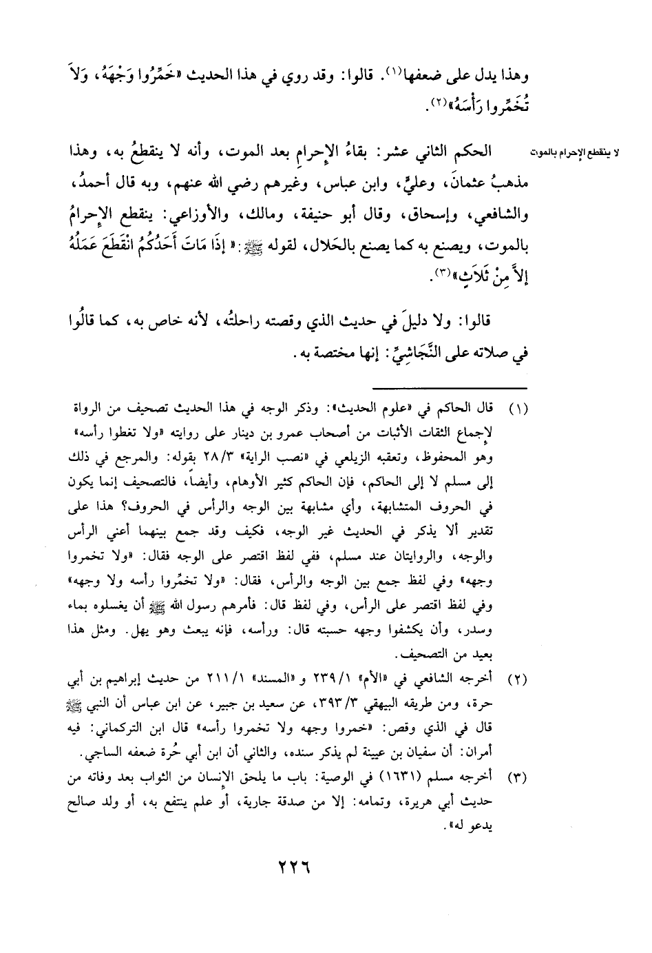 الْحُكْمُ الثَّانِيَ عَشَرَ: بَقَاءُ الْإِحْرَامِ بَعْدَ الْمَوْتِ، وَأَنَّهُ لَا يَنْقَطِعُ بِهِ، وَهَذَا مَذْهَبُ عثمان، وعلي، وَابْنِ عَبَّاسٍ، وَغَيْرِهِمْ - رَضِيَ اللَّهُ عَنْهُمْ -، وَبِهِ قَالَ أحمد، وَالشَّافِعِيُّ، وإسحاق، وَقَالَ أبو حنيفة، ومالك، وَالْأَوْزَاعِيُّ: يَنْقَطِعُ الْإِحْرَامُ بِالْمَوْتِ، وَيُصْنَعُ بِهِ كَمَا يُصْنَعُ بِالْحَلَالِ، لِقَوْلِهِ - صَلَّى اللَّهُ عَلَيْهِ وَسَلَّمَ -: " «إِذَا مَاتَ أَحَدُكُمُ انْقَطَعَ عَمَلُهُ إِلَّا مِنْ ثَلَاثٍ» ".