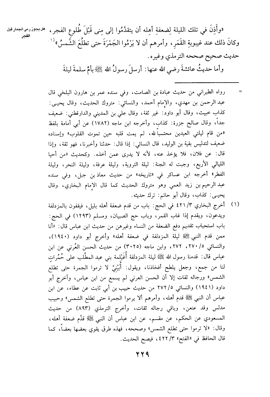" «وَأَذِنَ فِي تِلْكَ اللَّيْلَةِ لِضَعَفَةِ أَهْلِهِ أَنْ يَتَقَدَّمُوا إِلَى مِنًى قَبْلَ طُلُوعِ الْفَجْرِ، وَكَانَ ذَلِكَ عِنْدَ غَيْبُوبَةِ الْقَمَرِ، وَأَمَرَهُمْ أَنْ لَا يَرْمُوا الْجَمْرَةَ حَتَّى تَطْلُعَ الشَّمْسُ» "حَدِيثٌ صَحِيحٌ صَحَّحَهُ الترمذي وَغَيْرُهُ.