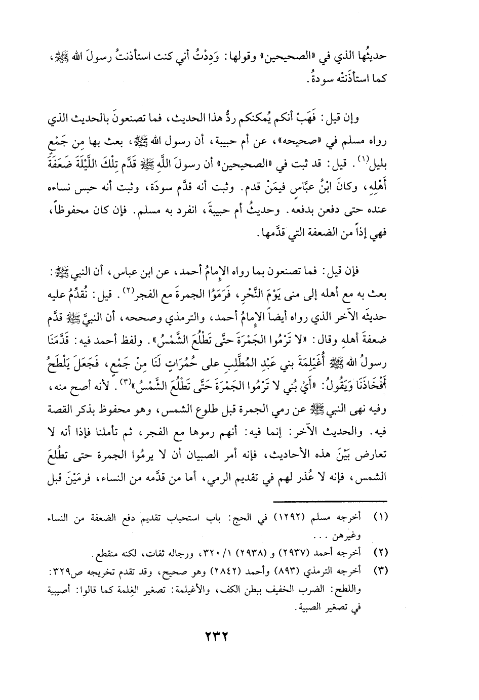 وَإِنْ قِيلَ: فَهَبْ أَنَّكُمْ يُمْكِنُكُمْ رَدَّ هَذَا الْحَدِيثِ، فَمَا تَصْنَعُونَ بِالْحَدِيثِ الَّذِي رَوَاهُ مسلم فِي "صَحِيحِهِ"، عَنْ أم حبيبة، أَنَّ رَسُولَ اللَّهِ - صَلَّى اللَّهُ عَلَيْهِ وَسَلَّمَ -، بَعَثَ بِهَا مِنْ جَمْعٍ بِلَيْلٍ. قِيلَ قَدْ ثَبَتَ فِي " الصَّحِيحَيْنِ" «أَنَّ رَسُولَ اللَّهِ - صَلَّى اللَّهُ عَلَيْهِ وَسَلَّمَ - قَدَّمَ تِلْكَ اللَّيْلَةَ ضَعَفَةَ أَهْلِهِ» ، وَكَانَ ابْنُ عَبَّاسٍ فِيمَنْ قَدَّمَ. وَثَبَتَ أَنَّهُ قَدَّمَ سودة، وَثَبَتَ أَنَّهُ حَبَسَ نِسَاءَهُ عِنْدَهُ حَتَّى دَفَعْنَ بِدَفْعِهِ. وَحَدِيثُ أم حبيبة، انْفَرَدَ بِهِ مسلم. فَإِنْ كَانَ مَحْفُوظًا، فَهِيَ إِذًا مِنَ الضَّعَفَةِ الَّتِي قَدَّمَهَا.