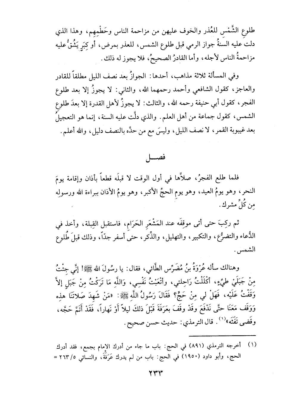 وَهُنَالِكَ سَأَلَهُ عروة بن مضرس الطائي، فَقَالَ: يَا رَسُولَ اللَّهِ - صَلَّى اللَّهُ عَلَيْهِ وَسَلَّمَ -! إِنِّي جِئْتُ مِنْ جَبَلَيْ طَيِّئٍ، أَكْلَلْتُ رَاحِلَتِي، وَأَتْعَبْتُ نَفْسِي، وَاللَّهِ مَا تَرَكْتُ مِنْ جَبَلٍ إِلَّا وَقَفْتُ عَلَيْهِ، فَهَلْ لِي مِنْ حَجٍّ؟ فَقَالَ رَسُولُ اللَّهِ - صَلَّى اللَّهُ عَلَيْهِ وَسَلَّمَ -: " «مَنْ شَهِدَ صَلَاتَنَا هَذِهِ وَوَقَفَ مَعَنَا حَتَّى نَدْفَعَ وَقَدْ وَقَفَ بِعَرَفَةَ قَبْلَ ذَلِكَ لَيْلًا أَوْ نَهَارًا، فَقَدْ أَتَمَّ حَجَّهُ، وَقَضَى تَفَثَهُ» " قَالَ الترمذي: حَدِيثٌ حَسَنٌ صَحِيحٌ.