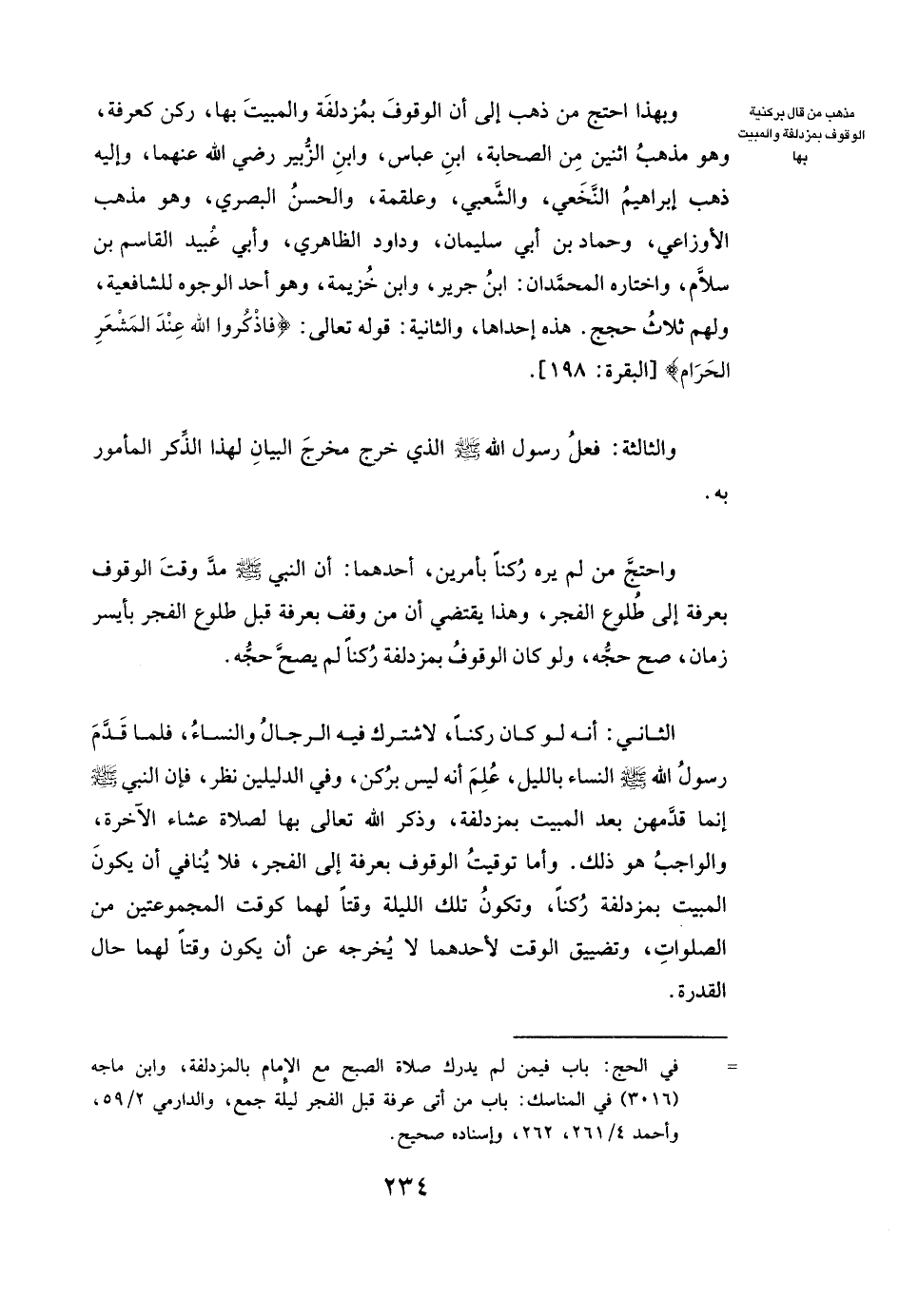 وَبِهَذَا احْتَجَّ مَنْ ذَهَبَ إِلَى أَنَّ الْوُقُوفَ بِمُزْدَلِفَةَ وَالْمَبِيتَ بِهَا، رُكْنٌ كَعَرَفَةَ، وَهُوَ مَذْهَبُ اثْنَيْنِ مِنَ الصَّحَابَةِ: ابْنِ عَبَّاسٍ، وابن الزبير - رَضِيَ اللَّهُ عَنْهُمَا -، وَإِلَيْهِ ذَهَبَ إِبْرَاهِيمُ النَّخَعِيُّ، وَالشَّعْبِيُّ، وعلقمة، وَالْحَسَنُ الْبَصْرِيُّ، وَهُوَ مَذْهَبُ الْأَوْزَاعِيِّ، وَحَمَّادِ بْنِ أَبِي سُلَيْمَانَ، وَدَاوُدَ الظَّاهِرِيِّ، وَأَبِي عُبَيْدِ الْقَاسِمِ بْنِ سَلَّامٍ، وَاخْتَارَهُ الْمُحَمَّدَانِ: ابْنُ جَرِيرٍ، وَابْنُ خُزَيْمَةَ، وَهُوَ أَحَدُ الْوُجُوهِ لِلشَّافِعِيَّةِ، وَلَهُمْ ثَلَاثُ حُجَجٍ. هَذِهِ إِحْدَاهَا، وَالثَّانِيَةُ: قَوْلُهُ تَعَالَى: {فَاذْكُرُوا اللَّهَ عِنْدَ الْمَشْعَرِ الْحَرَامِ} [البقرة: 198] [الْبَقَرَةُ 198] .