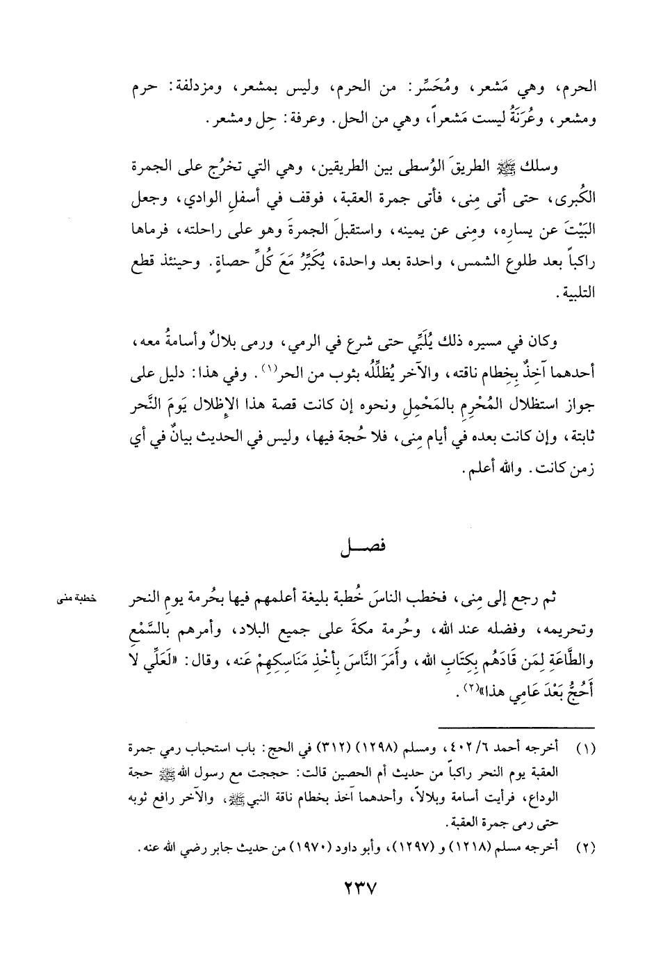 ثُمَّ رَجَعَ إِلَى مِنًى، فَخَطَبَ النَّاسَ خُطْبَةً بَلِيغَةً أَعْلَمَهُمْ فِيهَا بِحُرْمَةِ يَوْمِ النَّحْرِ، وَتَحْرِيمِهِ، وَفَضْلِهِ عِنْدَ اللَّهِ، وَحُرْمَةِ مَكَّةَ عَلَى جَمِيعِ الْبِلَادِ، وَأَمَرَهُمْ بِالسَّمْعِ، وَالطَّاعَةِ لِمَنْ قَادَهُمْ بِكِتَابِ اللَّهِ، وَأَمَرَ النَّاسَ بِأَخْذِ مَنَاسِكِهِمْ عَنْهُ، وَقَالَ: " «لَعَلِّي لَا أَحُجُّ بَعْدَ عَامِي هَذَا» ".