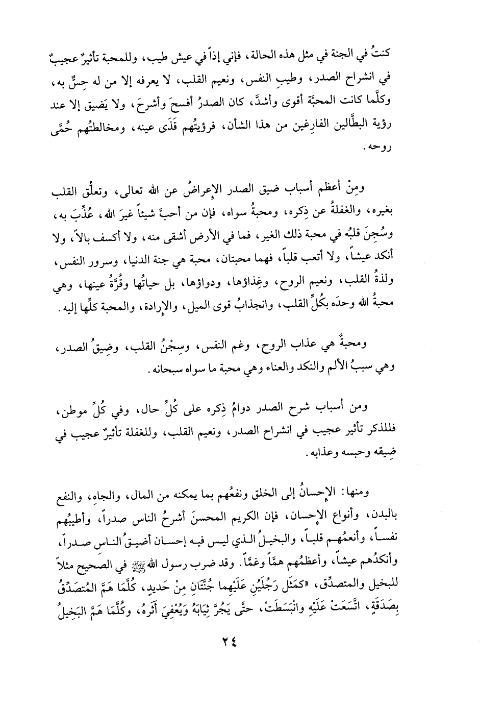 وَلِلْمَحَبَّةِ تَأْثِيرٌ عَجِيبٌ فِي انْشِرَاحِ الصَّدْرِ وَطِيبِ النَّفْسِ وَنَعِيمِ الْقَلْبِ، لَا يَعْرِفُهُ إِلَّا مَنْ لَهُ حِسٌّ بِهِ، وَكُلَّمَا كَانَتِ الْمَحَبَّةُ أَقْوَى وَأَشَدَّ كَانَ الصَّدْرُ أَفْسَحَ وَأَشْرَحَ، وَلَا يَضِيقُ إِلَّا عِنْدَ رُؤْيَةِ الْبَطَّالِينَ الْفَارِغِينَ مِنْ هَذَا الشَّأْنِ، فَرُؤْيَتُهُمْ قَذَى عَيْنِهِ، وَمُخَالَطَتُهُمْ حُمَّى رُوحِهِ.