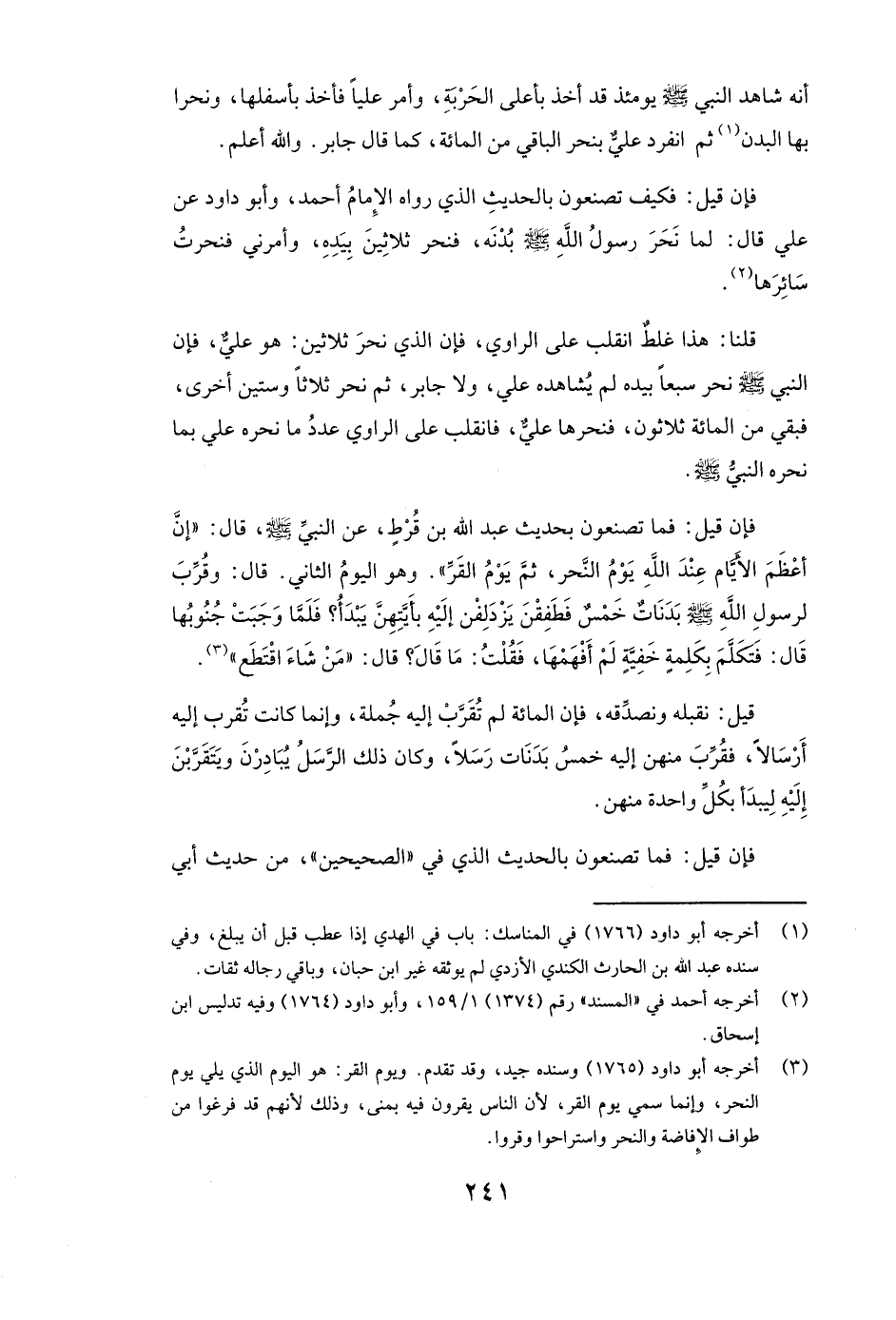 فَإِنْ قِيلَ: فَكَيْفَ تَصْنَعُونَ بِالْحَدِيثِ الَّذِي رَوَاهُ الْإِمَامُ أَحْمَدُ، وأبو داود، عَنْ علي قَالَ: «لَمَّا نَحَرَ رَسُولُ اللَّهِ - صَلَّى اللَّهُ عَلَيْهِ وَسَلَّمَ - بُدْنَهُ، فَنَحَرَ ثَلَاثِينَ بِيَدِهِ، وَأَمَرَنِي فَنَحَرْتُ سَائِرَهَا» .